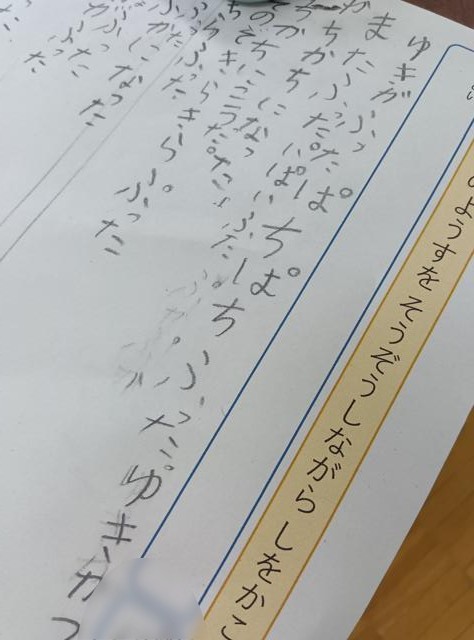 を意識しながら書いていました。例えば雪の降るようすを表すのにもオノマトペを添えます。子どもの発想がおもしろいです。