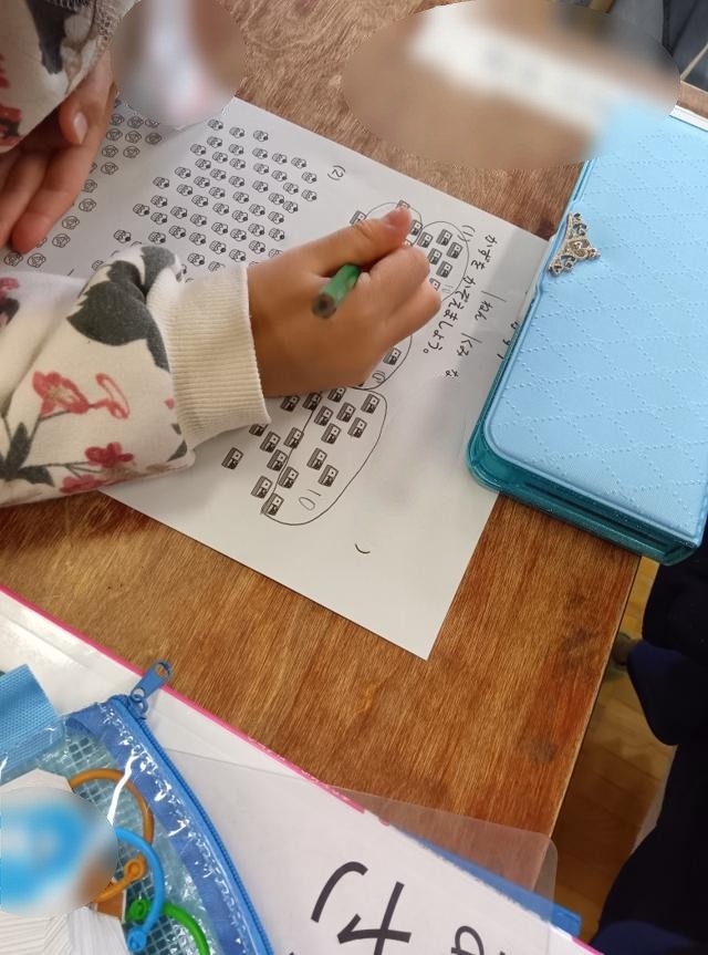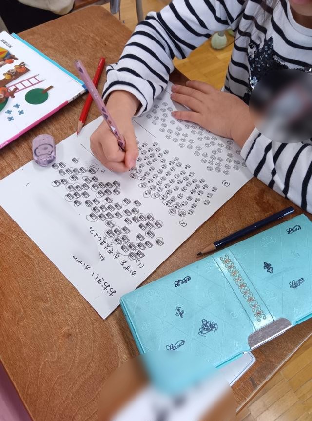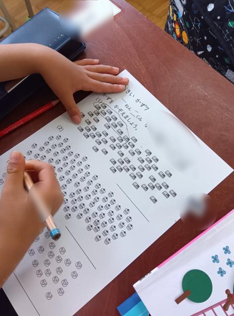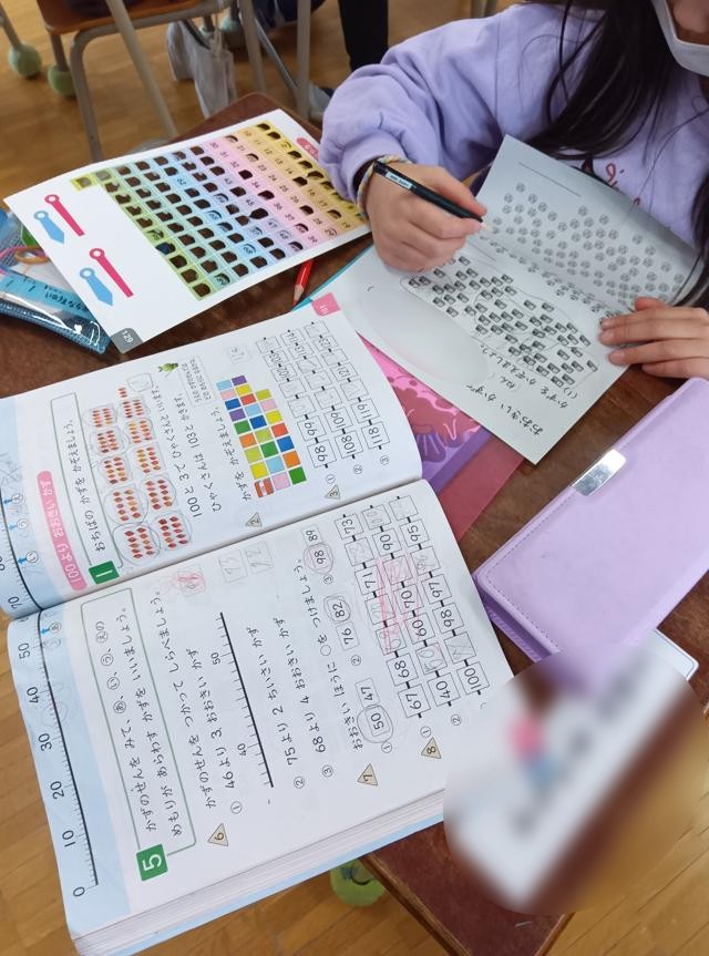 算数で、「大きいかず」の学習に入っている1年生、一生懸命数を数えています。ものがパッと見ただけでは数が分からないくらいたくさん並んでいます。