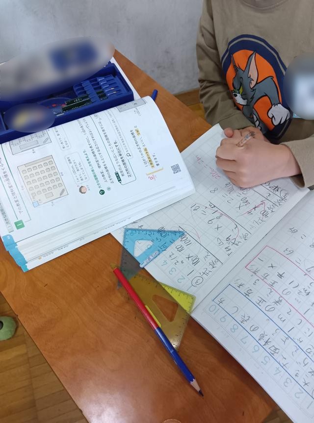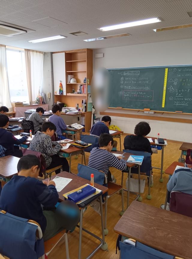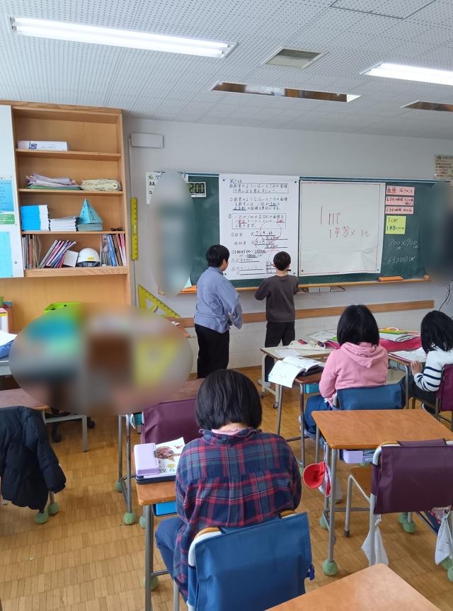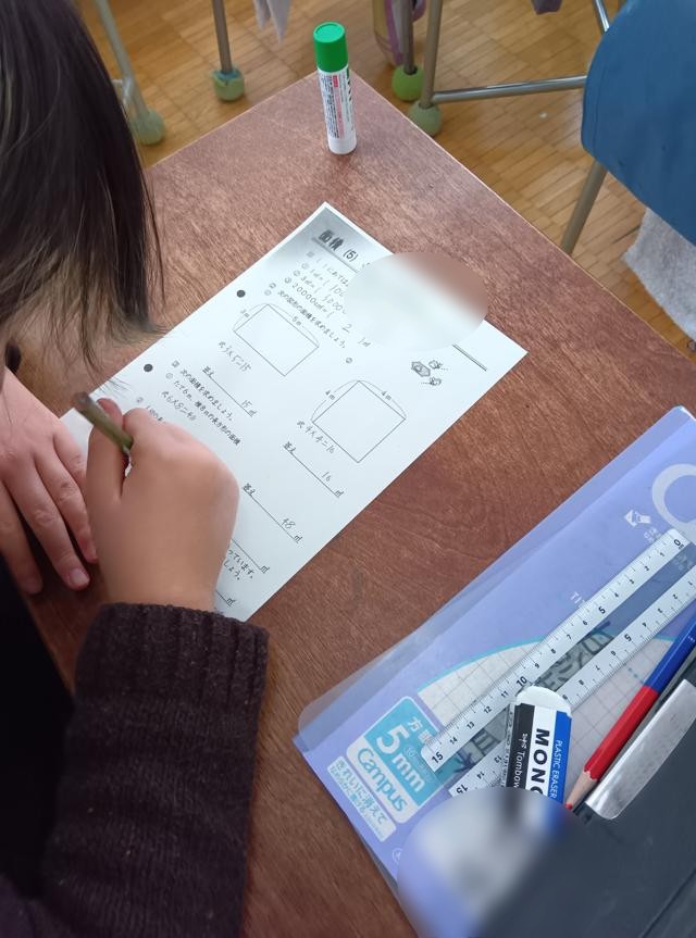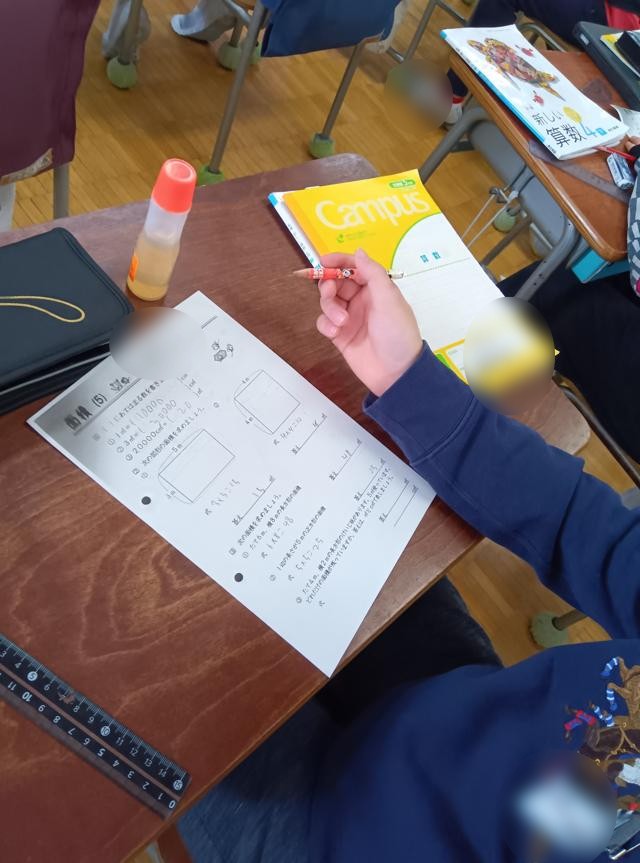 算数で面積の学習をしている4年生、少し大きな単位「平方メートル」も習って、問題を解いていました。