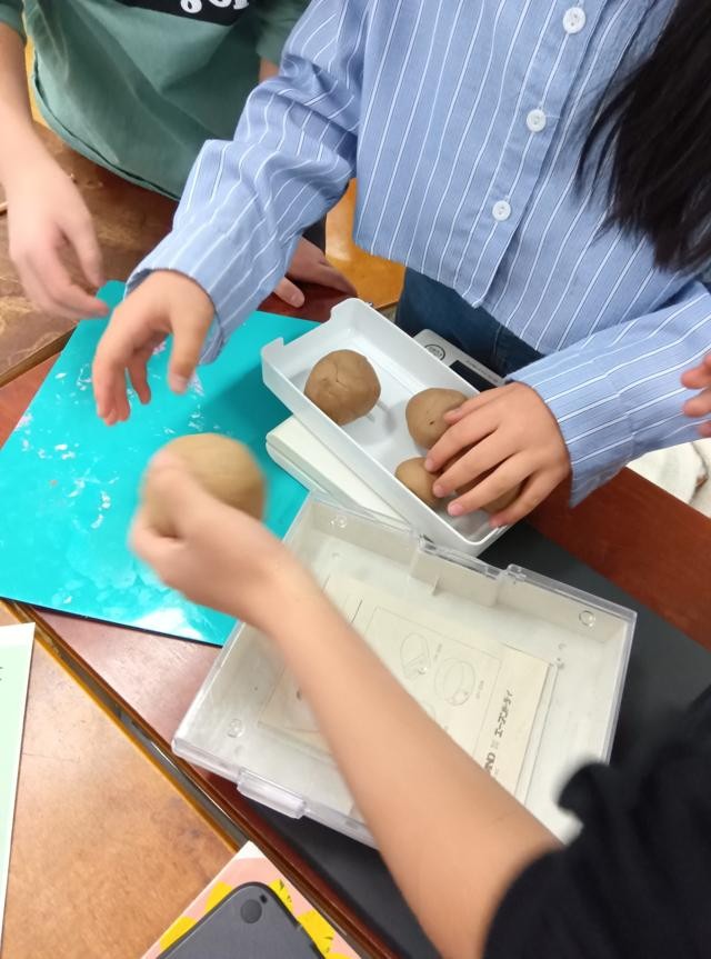 丸めると軽くなるの?重力が丸みで滑る?おそらく誤差か、形を変える途中で小さなかけらが落ちた、などの理由だと思いますが・・・形を変えても物の重さは変わりません。どんな形にしても・・・と見ていると、粘土でお皿を作り始めた子がいて、何となく、お皿ならずっしりとして重くなるかも、などと妄想してしまいましたが、おそらく重さは変わらないでしょう。