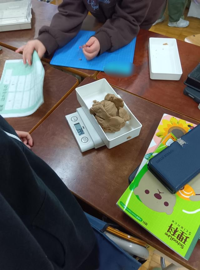 3年生、理科「もののおもさ」の学習の続きです。「粘土」の重さを量っています。