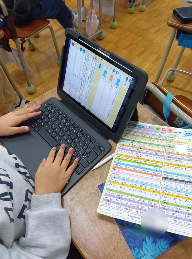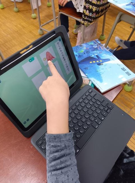 別の学級では、国語で「書く」学習をしていました。「たから島の地図」から想像を広げて、物語を書いていきます。タブレット端末で、設定を作っているところでしたが、キャラクターの絵も入れられるところがあって、これは子どもたちが夢中になって楽しく活動できそうだなと思いました。また、物語ができていく過程も追っていきたいと思います。
