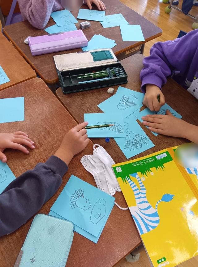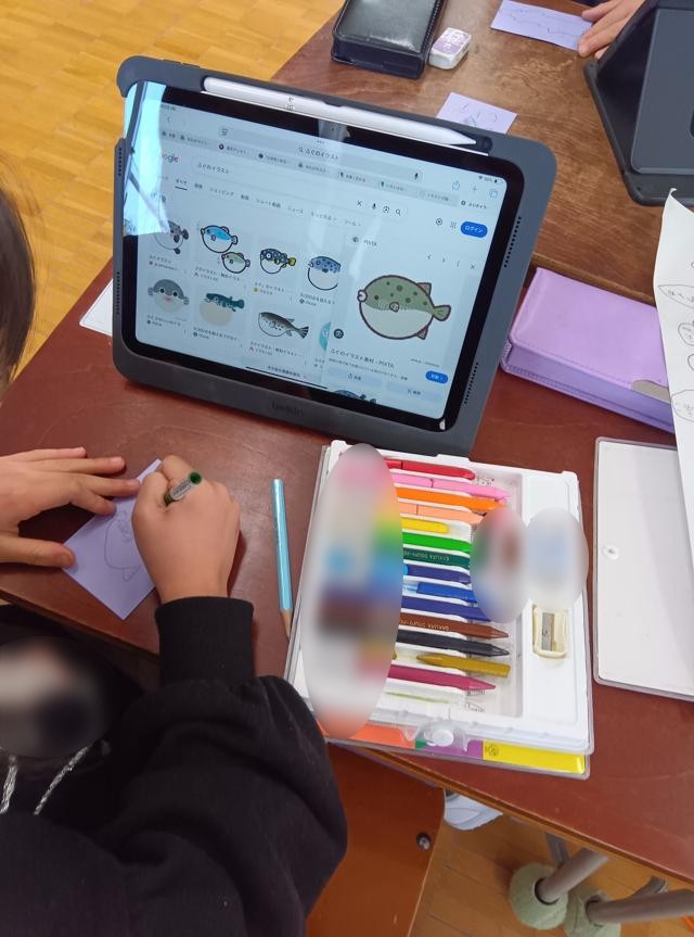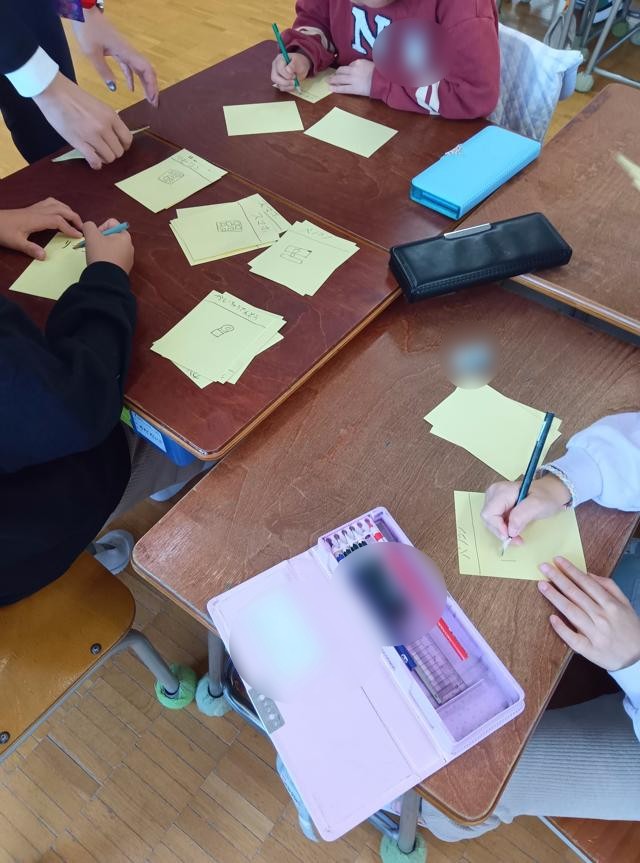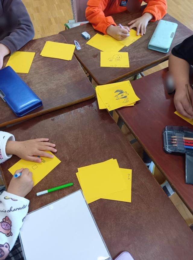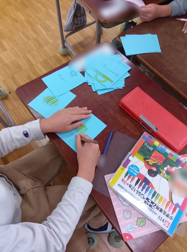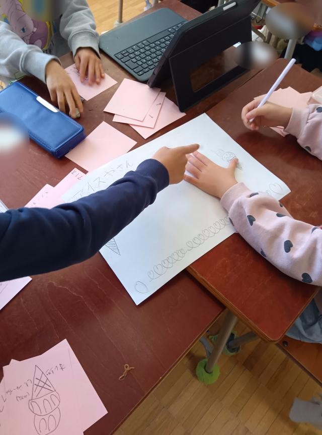 などたくさんの物とそこに含まれる物の名前を挙げ、カードにしていました。どうやらたくさんの言葉を集めて、お店屋さんを開くようです。たくさんの品物を取り扱った方が楽しい活動になります。できるだけたくさん商品をそろえてお店屋さんを開くために、言葉をひねり出し、収集していきました。売れ筋商品は多めに?タコとイカがたくさん作られていました。聞いてみると「好きだから。」とのことでした・・・売れるといいな。