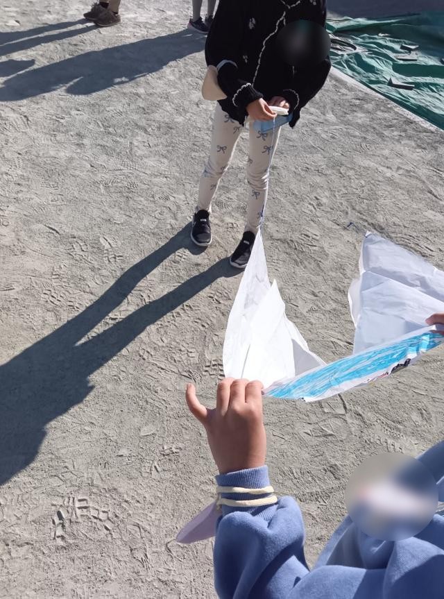 あとは、この日もでしたが、この学習、5年生の電磁石のコイルと同じくらい、絡まります。2人の糸が絡まったくらいならまだかわいいもので、2人が絡まっているところにもう1人が突っ込んできて3人、4人で糸がこんがらがってどうにもならないなんていうのはざらです。ちょっと泣きそうになる光景が広がります。この日もしっかり絡まっていました。ほどけそうならほどきますが、大抵ははさみで切ってつなぎ直します。凧はうまく揚がったし、絡まらない凧の揚げ方、遊び方を探究してみるのもおもしろいかもしれませんね。