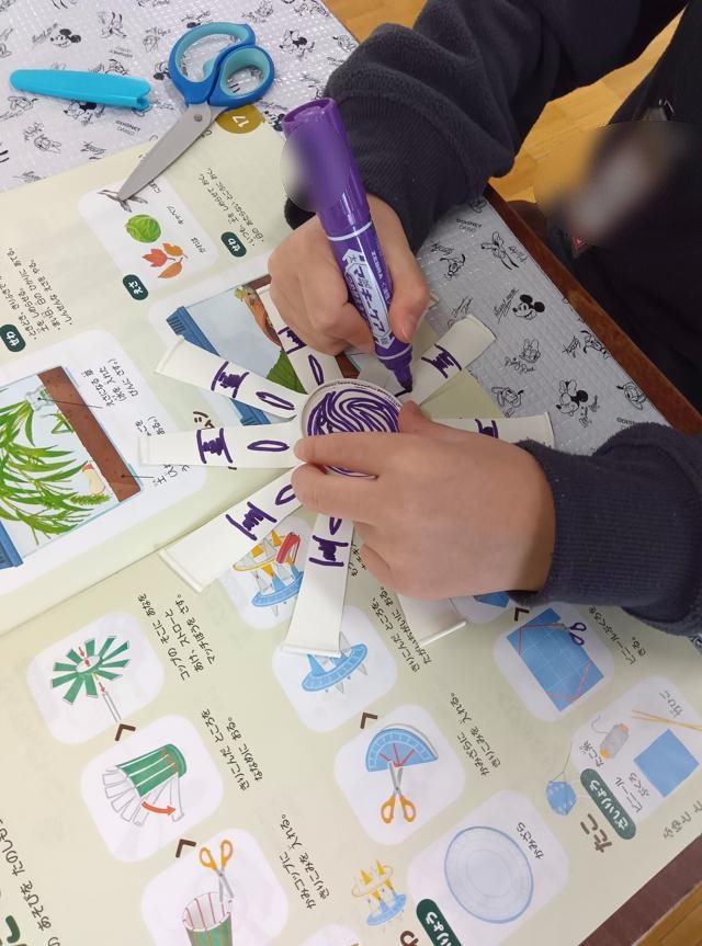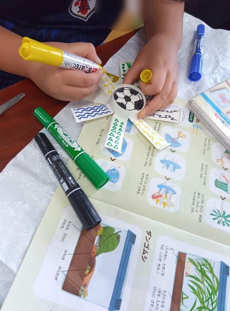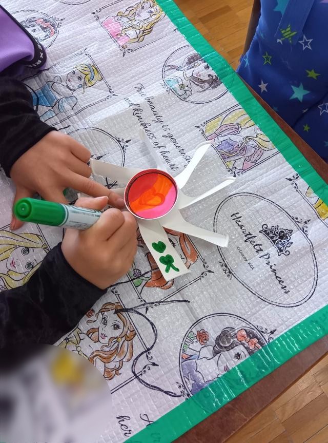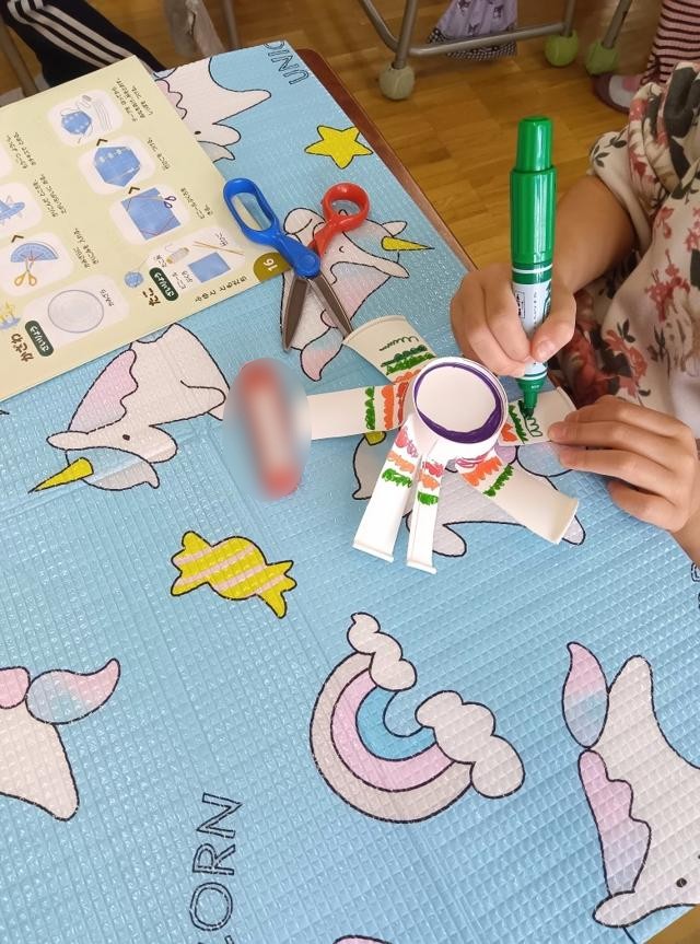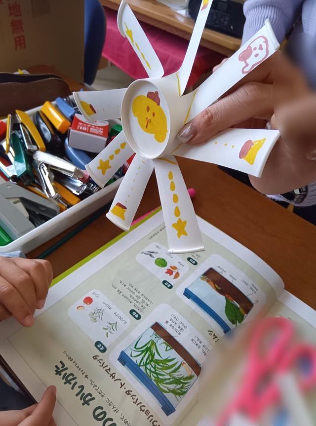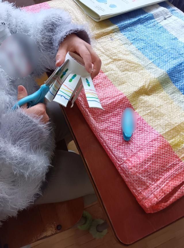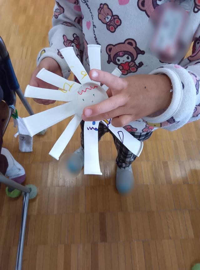 絵まで描いたら、軸に付けるために、先生が底の真ん中の部分に穴を空けてくれます。1枚目、顔を描いていた子は、ここに穴が空くところまで想定してこれを描いていたのでしょうか。ピッタリの位置に「鼻」ができました。