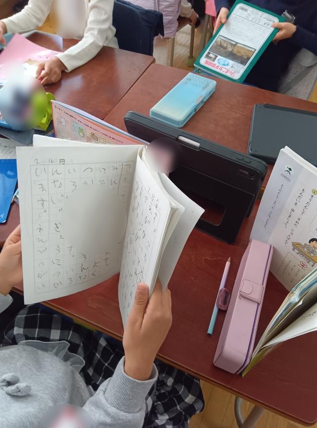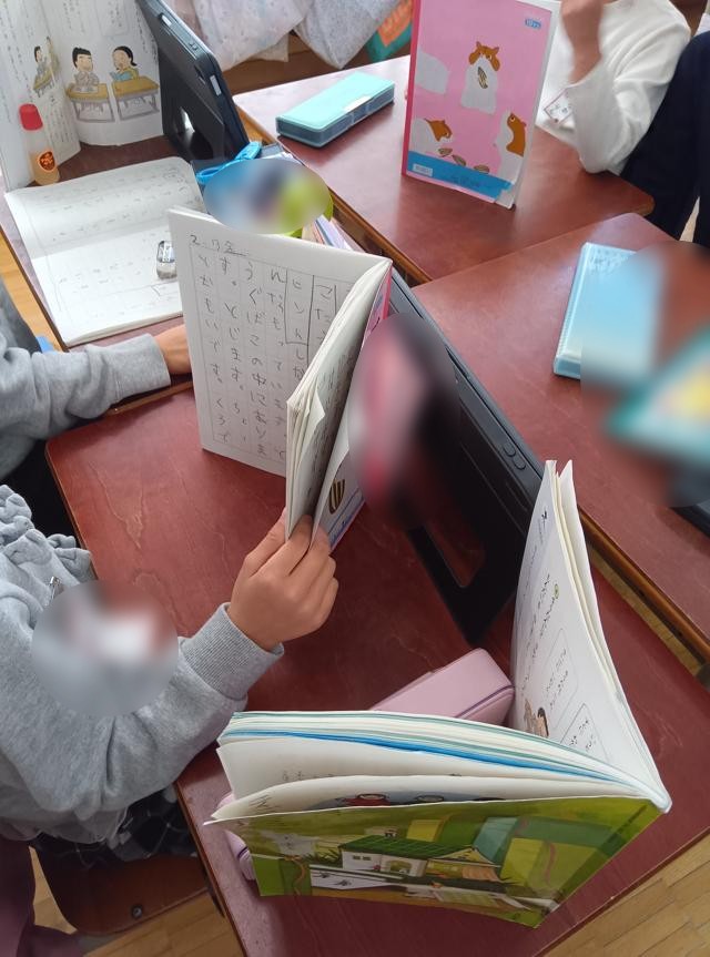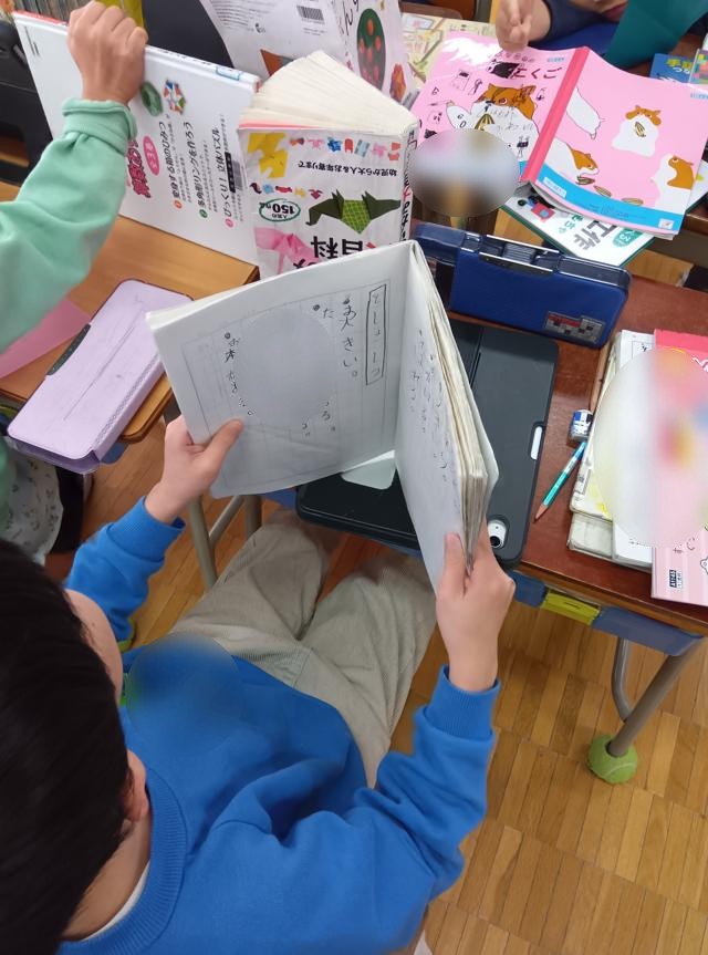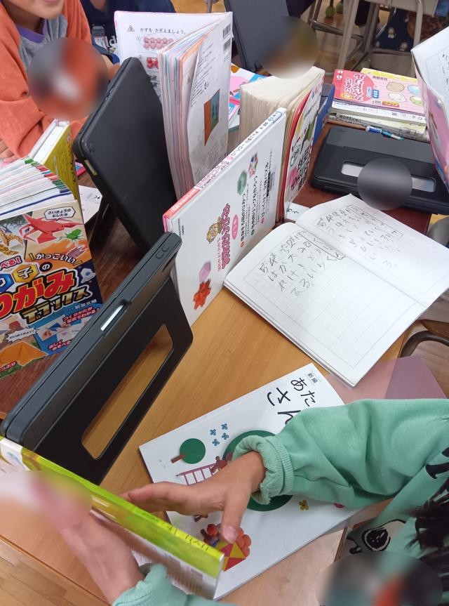 国語「これはなんでしょう」の学習でした。言葉をヒントに、何のことを言っているのかを当てていくクイズのような言葉の学習です。問題を読むのに、相手に見えないようにいろいろと物を並べていたようです。そんなことしなくても、見えないとは思いますが・・・。