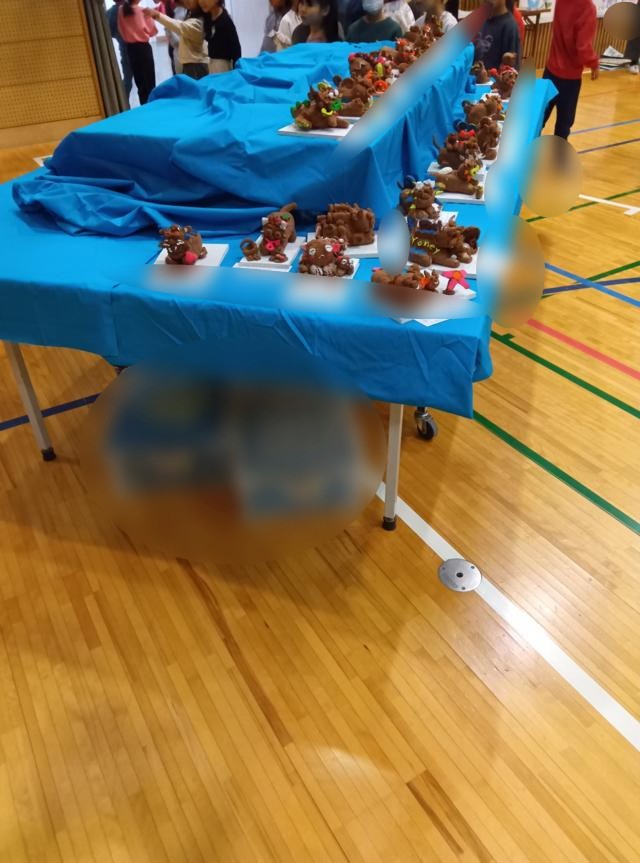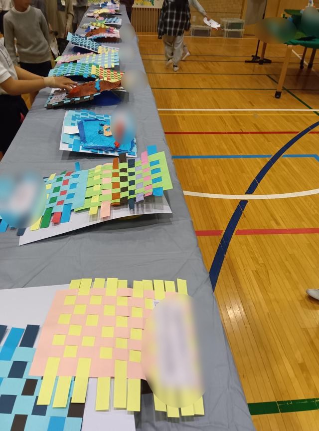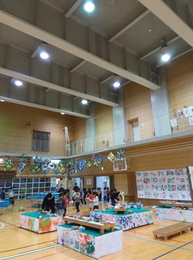 体育館に作品を持っていき、学年の展示場所で作品を置いていきます。場所や向きに「ここを見てほしい!」というそれぞれのこだわりが光ります。