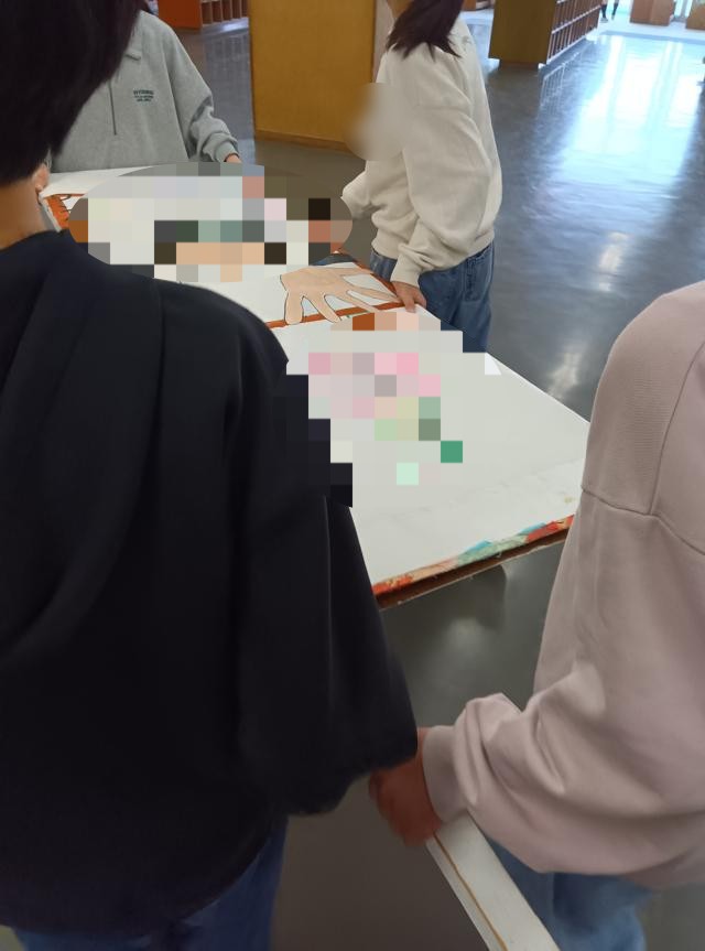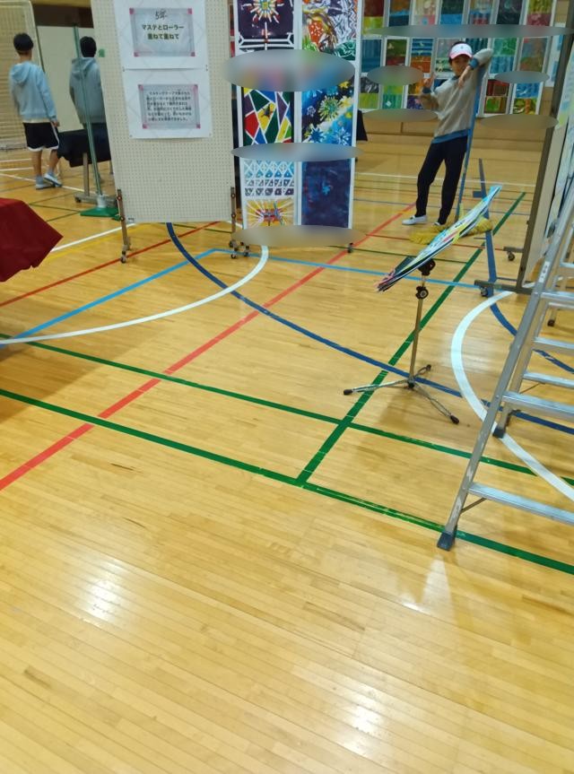 会場のそうじ、来校者の休憩スペースづくり、ワークショップの会場づくり、ファッション誌風冊子のセッティンッグ・・・今日は行事の大きな看板も完成し、えっさほっさと運ばれてきました。まだ絵柄はモザイクにしておきます。外と中に飾る2枚あるようです。