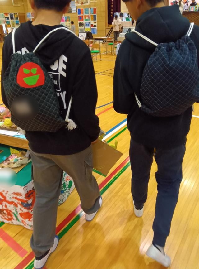 昨日今日は6年生の作品の搬入も続いています。立体作品を手に持ち、背中には家庭科作品のナップザック♪小粋なこの感じがいいですね。