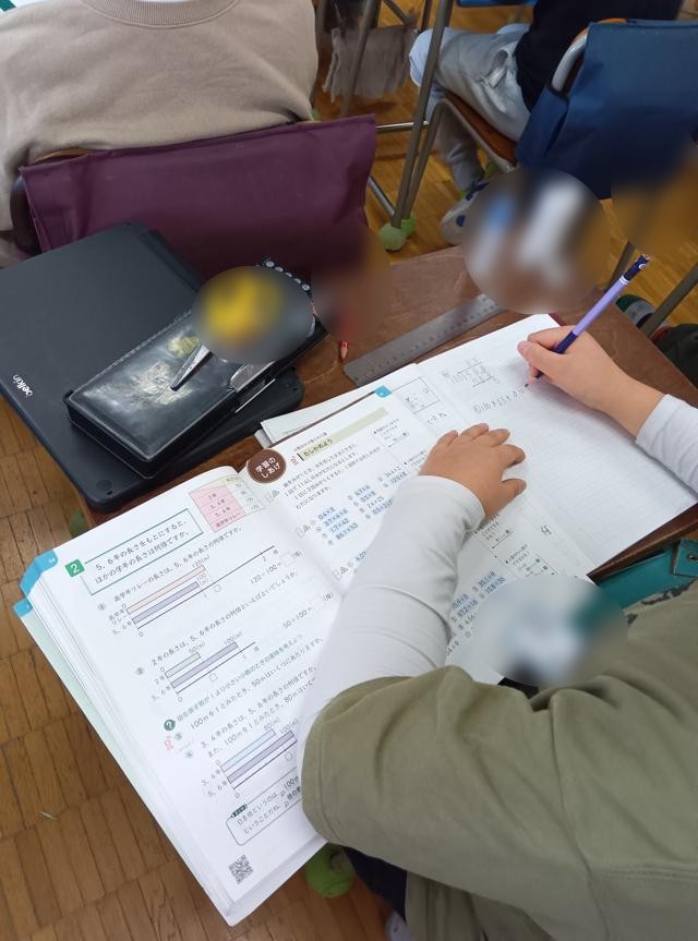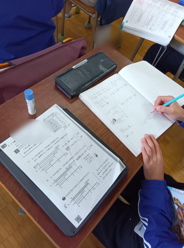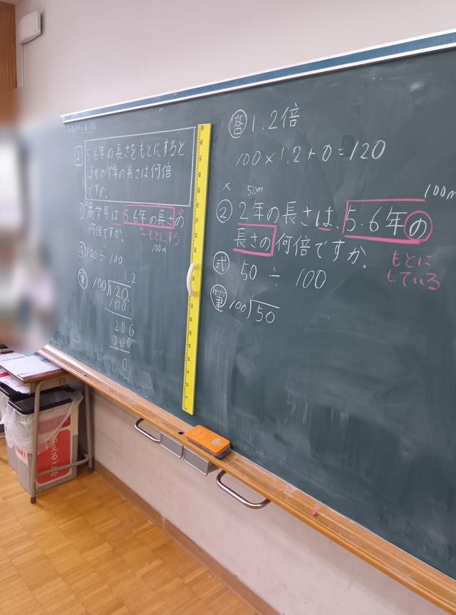 先日は、「小数倍」の学習をしていました。「〇倍」というと、大きくなる感じがしますが、小数倍の場合は1倍より小さい数字も表せるので、例えば、「0.8倍」というと、元の数よりも小さくなることも出てきます。小数の「意味」を広げて捉える学習です。