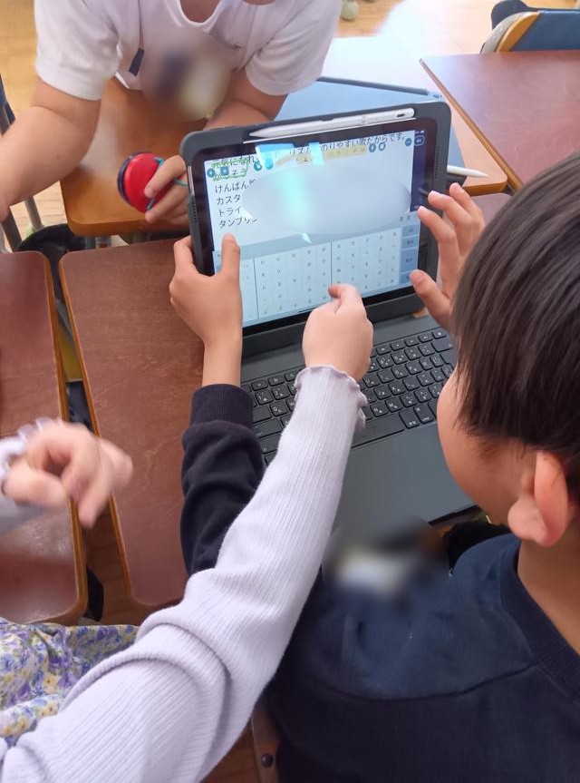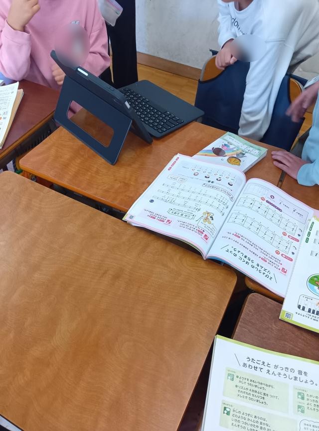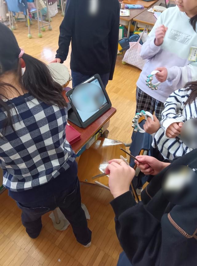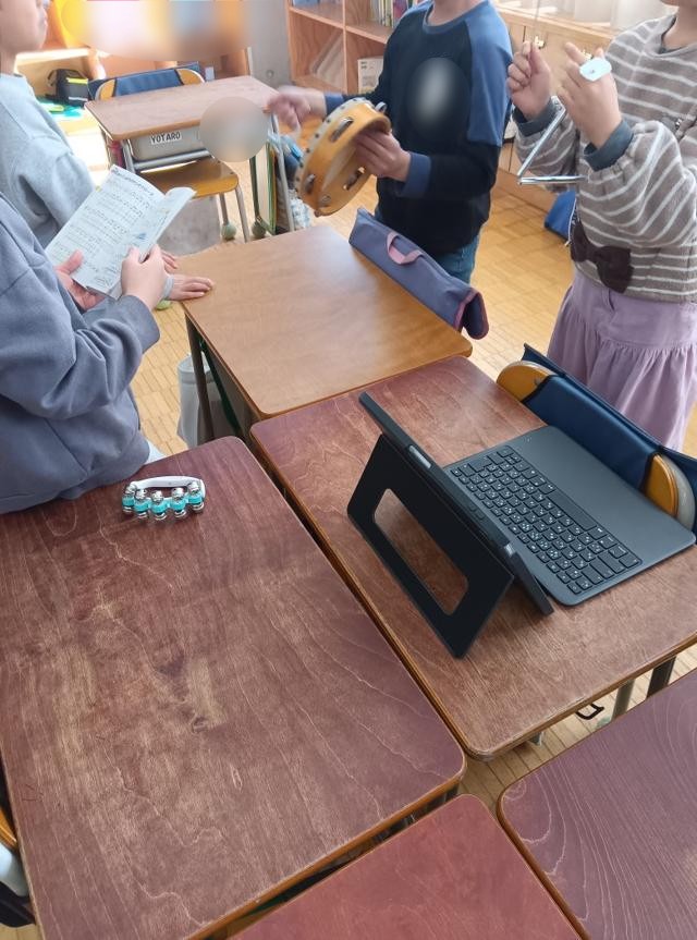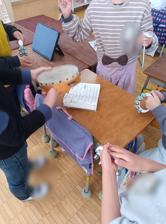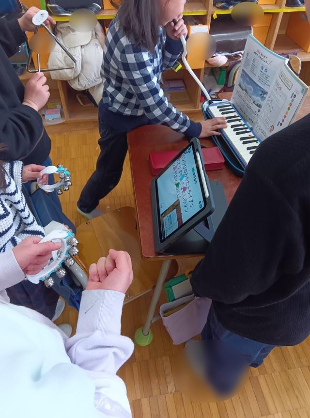 をリズムよく打って音を出していました。1・2年生ではこの辺りの打楽器での演奏が多いです。鍵盤ハーモニカでメロディーを弾いています。楽器を交換しながら、何度も練習を繰り返していました。しばらく見ていて、このリズムも話し合って子どもたちが作っているのが分かりました。確かに、すずのリズムが歌集に載っているわけはありません。タンブリンやトライアングルも同様です。