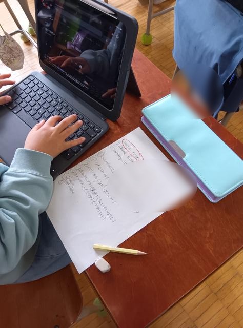いろいろと調べて、単語や文を書いています。それぞれ結構文字数を書いていますね。4年生までの外国語活動ではあまり「書く」活動はありませんが、3年生でローマ字の学習もしたので、アルファベットにも慣れてきているのだと思います。ローマ字に出てこない文字もありますが、よく見ながら書いていました。書くことで慣れていくということもありますので、こういう機会に書く経験をたくさんすることはいいことだと思います。