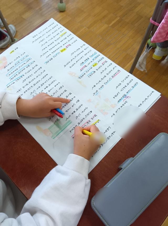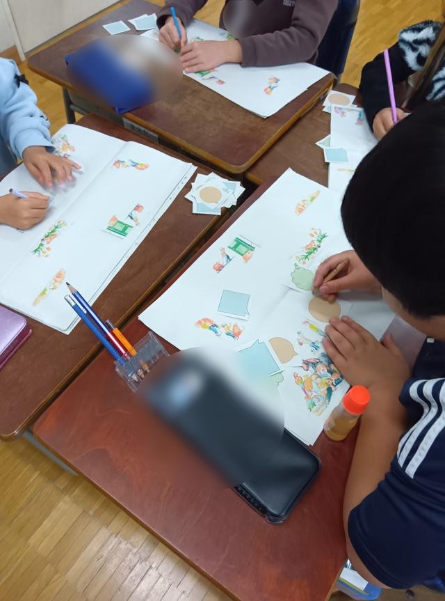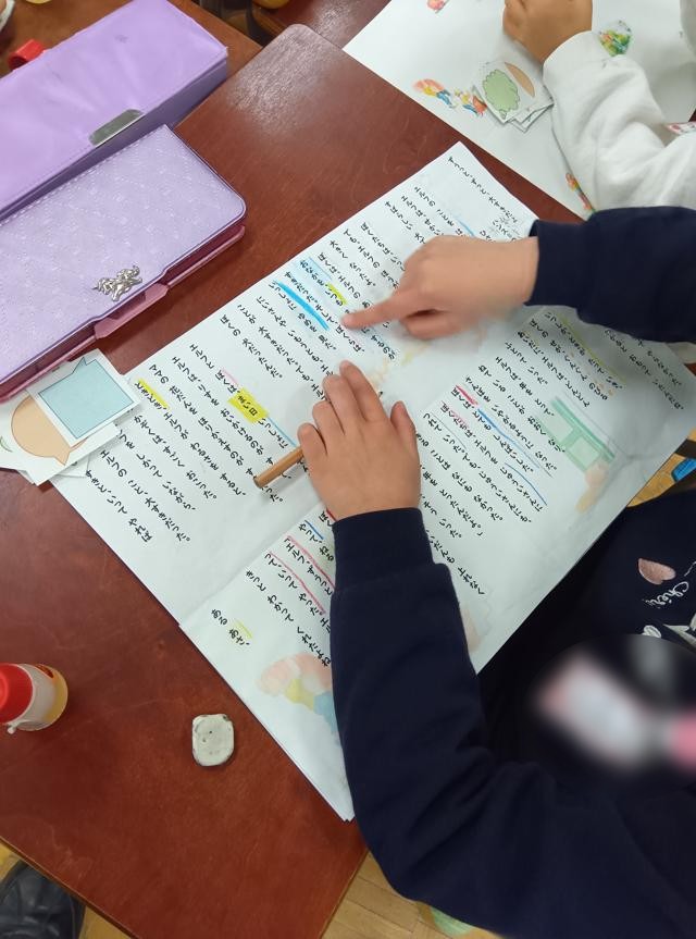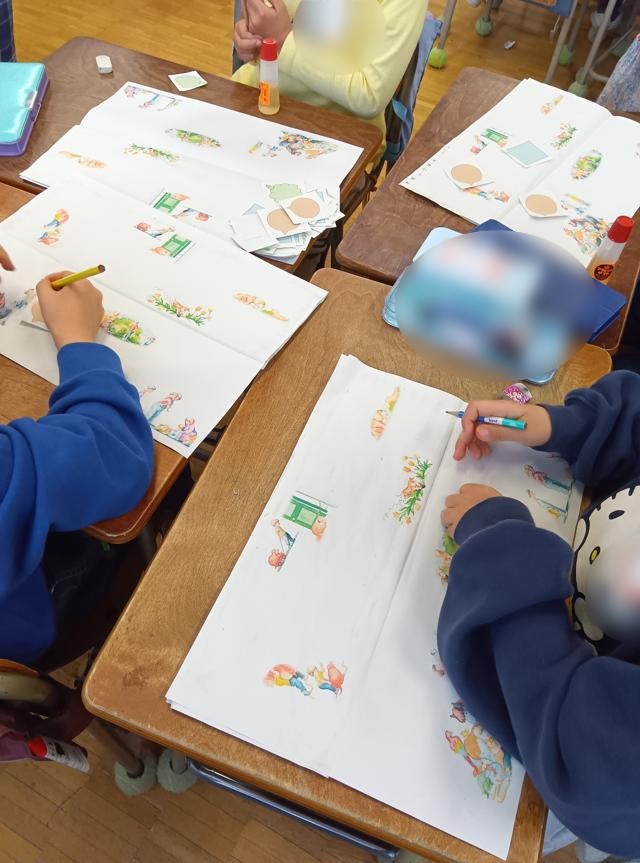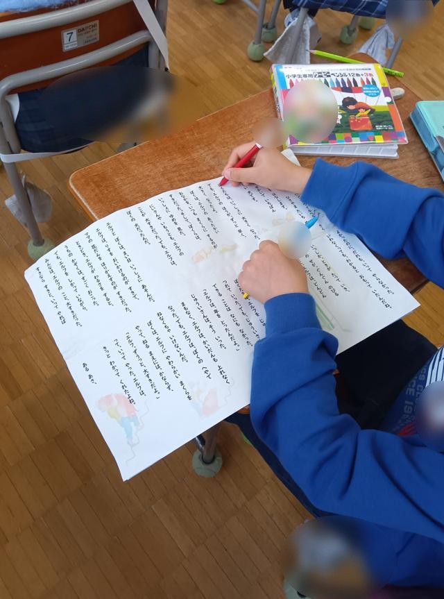 と書いてあります。登場人物や出来事を読み取っていくことを確認しました。「いつ」「だれ」「どうした」を色分けしながら、本文の中に探していきます。3色の複数のクーピーの持ち方、持ち替え方に「職人」の風情があります。大体の登場人物と出来事を押さえ、物語全体の流れをつかむことができました。次に、それを見ながら、主要な場面での登場人物の気持ちを吹き出しに表していきました。