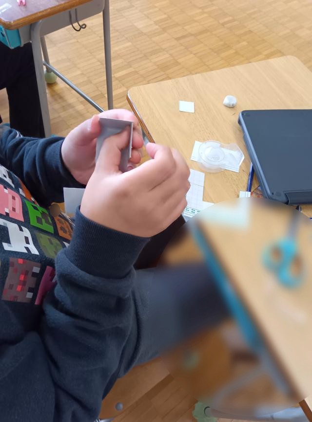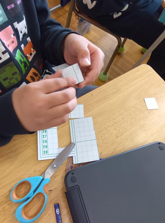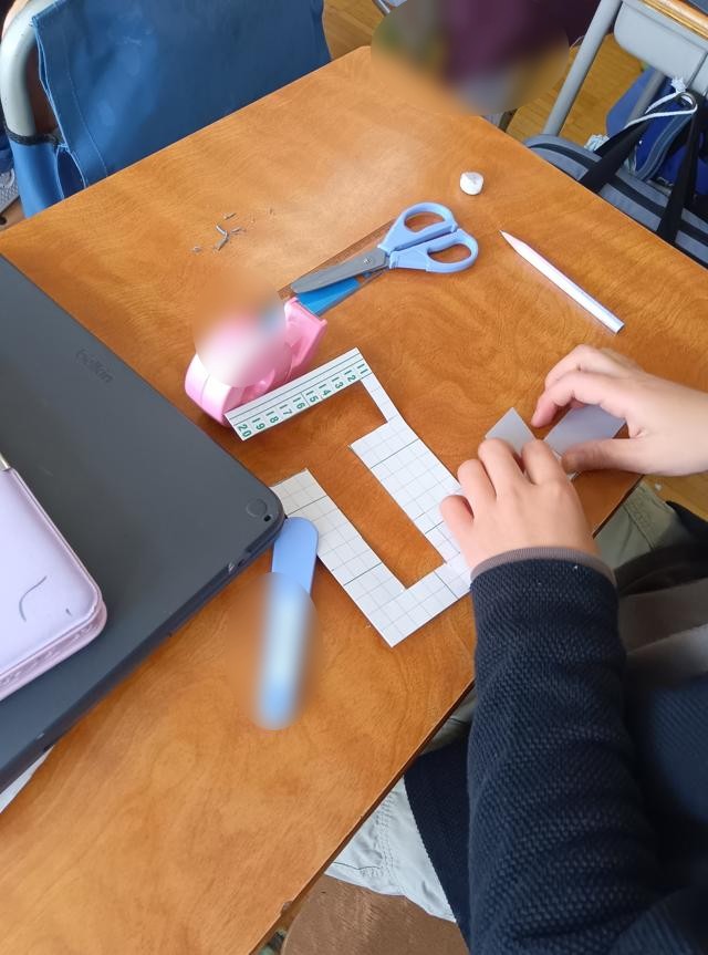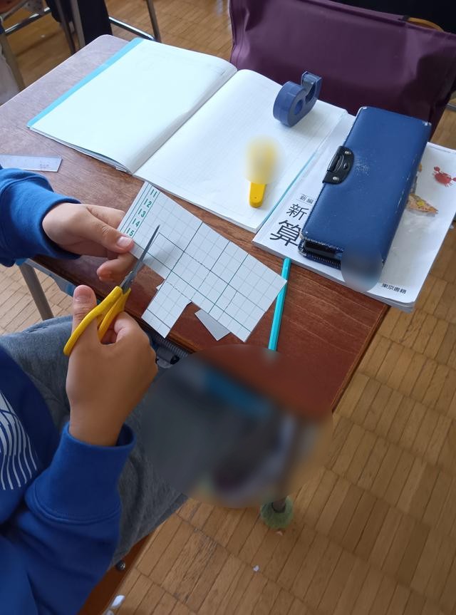 パタンパタンと折っていったときに、箱の形にさえなればどんなふうに面同士がついていてもOKです。それでいくと、辺の長さが全て同じの立方体は、結構多くの展開図が考えられます。全てのパターンを見付けようと子どもたちが紙を切っていました。頭の中で立体的にパタンパタンと折ることが得意な子と得意ではない子がいると思います。ということで、頭の中で描く子もいれば、ノートに展開図で考えていく子もいます。面を6枚用意して貼り合わせ考える子もいます。ちなみに私は「頭の中でパタンパタン」は苦手です。実際に物を動かしながら探るのがやりやすく感じるので、3番目派です。