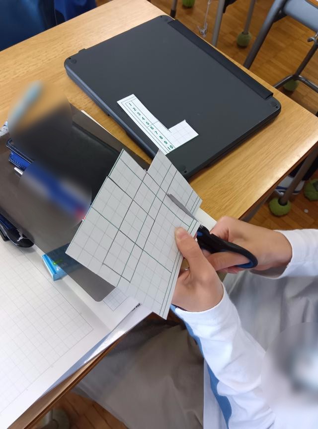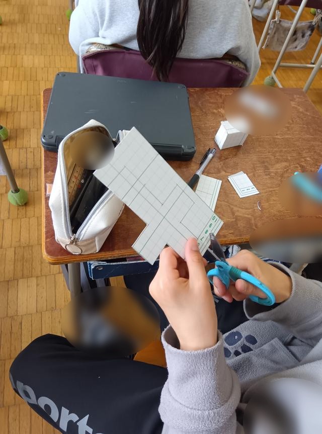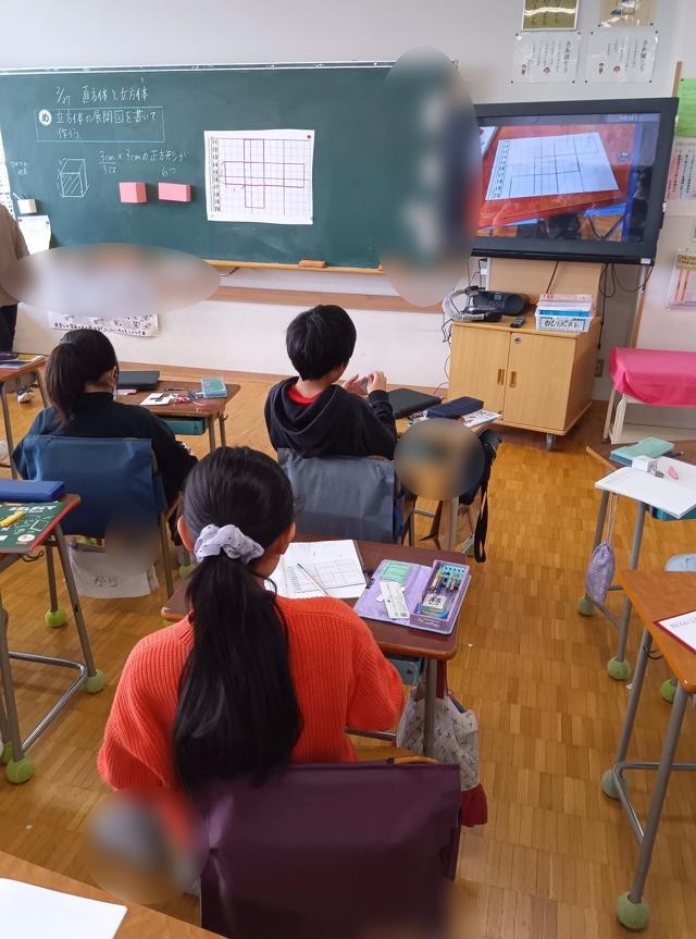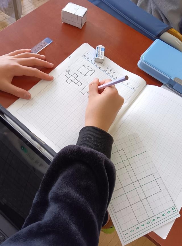 ここでは、直方体や立方体の概念や特徴、性質を学ぶとともに、展開図、見取図の意味と描き方についても学んでいきます。今回は、立方体つまり正方形で囲まれたサイコロの形の箱の展開図を考えていました。展開図は、「やっこさん型」が基本ですが、