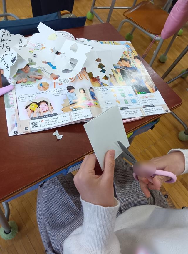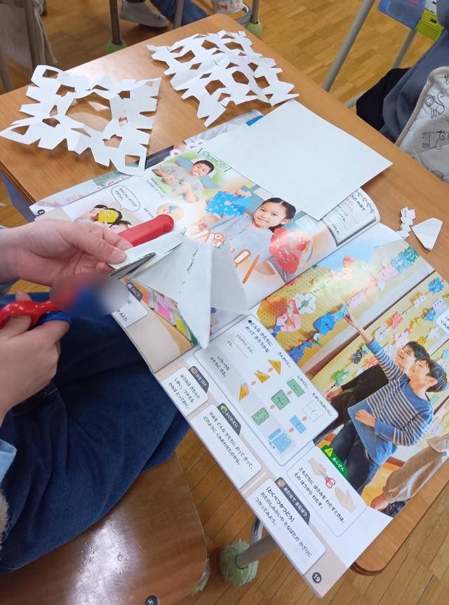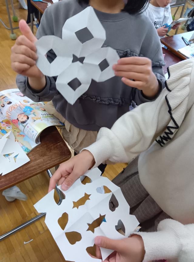 さて、後半は、図工「チョッキン パッ でかざろう」で切り紙のようなことをしているところです。折って、切った紙を開くと・・・同じ折り方でも、切るところによって全く違ったものができ上がります。そして、何度かやっていると、折り方と切り方である程度の予想をしながら切って開いている子もいました。すごい!でも偶然の作品を楽しむのもいいですね。