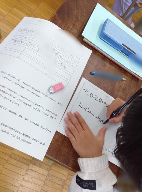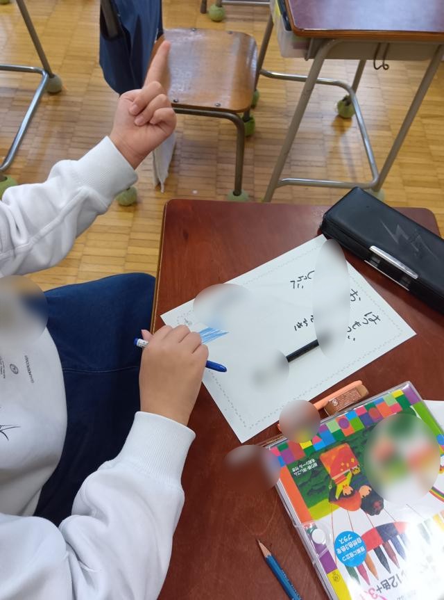 ワークシートにいくつか書き上げ、そこから1つ選んで用紙に書いていきます。ワークシートには、季語も含めて、たくさんの言葉が出てきていて、1年生からこれまでに定期的に俳句を詠むという機会はあったと思いますので、その積み重ねを感じます。一方で、五・七・五のリズムがまだ不安なのか、指折り数えて文字を入れ、確認していました。どちらの姿も、これが今の2年生なのだなということを感じる姿でした。