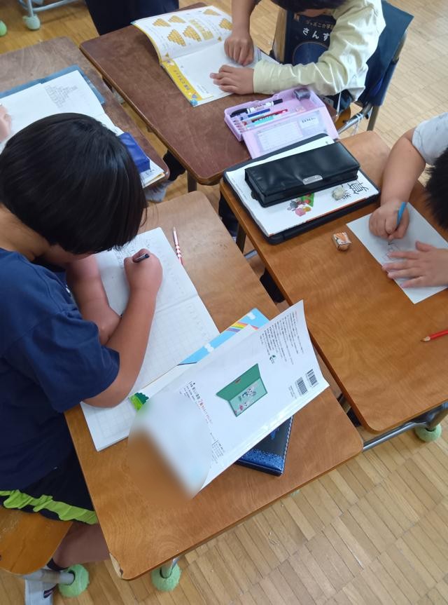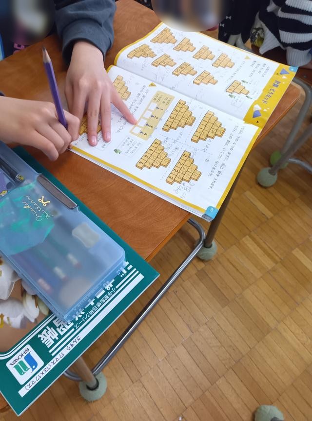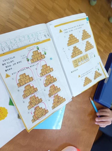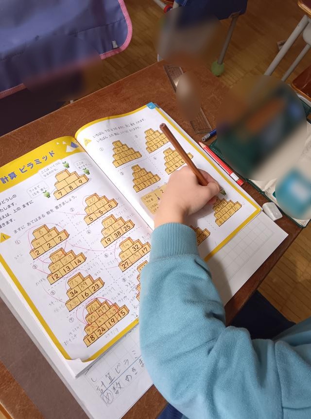 となり同士のますの数を足し、答えを2つのブロックの間の上にあるブロックに書きます。これを繰り返し、最後のてっぺんのブロックに入る数字を出します。初めの数が全部分かっていて、ただ足すだけなら簡単ですが、2年生の学習なのでそうはいきません。ところどころの数が抜けている問題ができてきました。こうなると、「引き算」も使わなくてはならなくなります。しかも、ここが分からないと次が分からないといった具合に、問題がよくできているので、しっかり考えさせられます。よく考えながら解いていました。