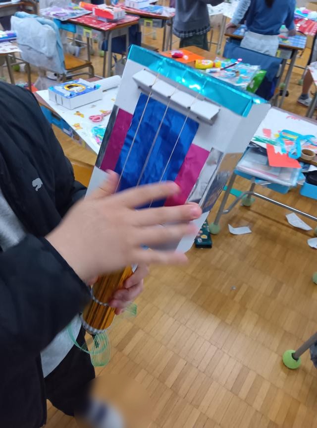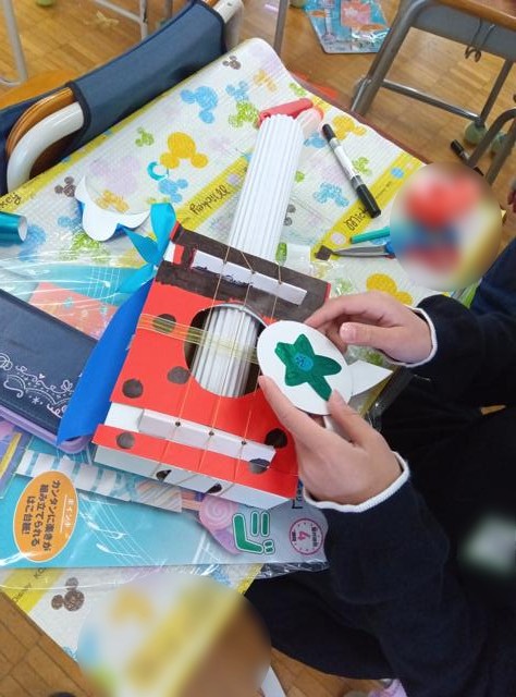 どうやら装飾が仕上がったようで、ポロロンという感じではなくなって、すっかりロッケンロール!な感じになっていました。サイズ感的には、ウクレレくらいの大きさなんですが、ハワイの陽気さをゆうに飛び越えています。爆音が聞こえてきそうです。