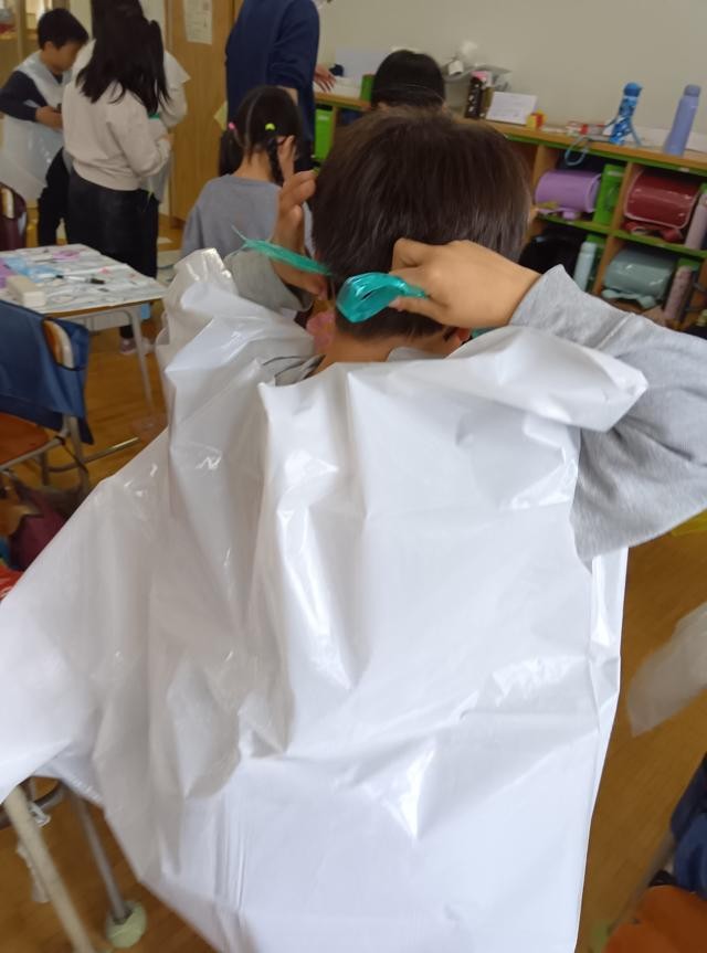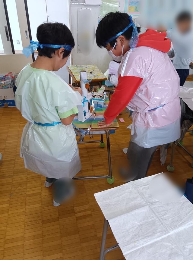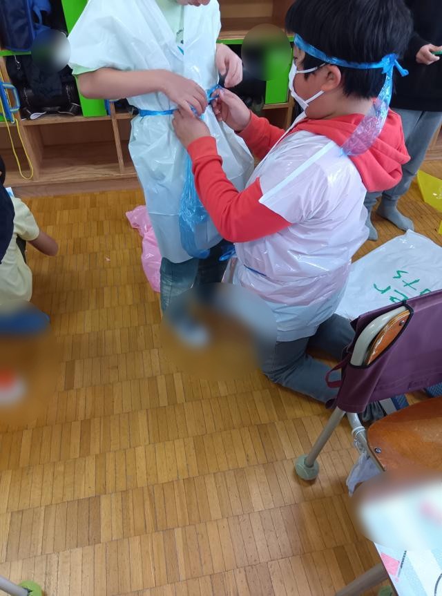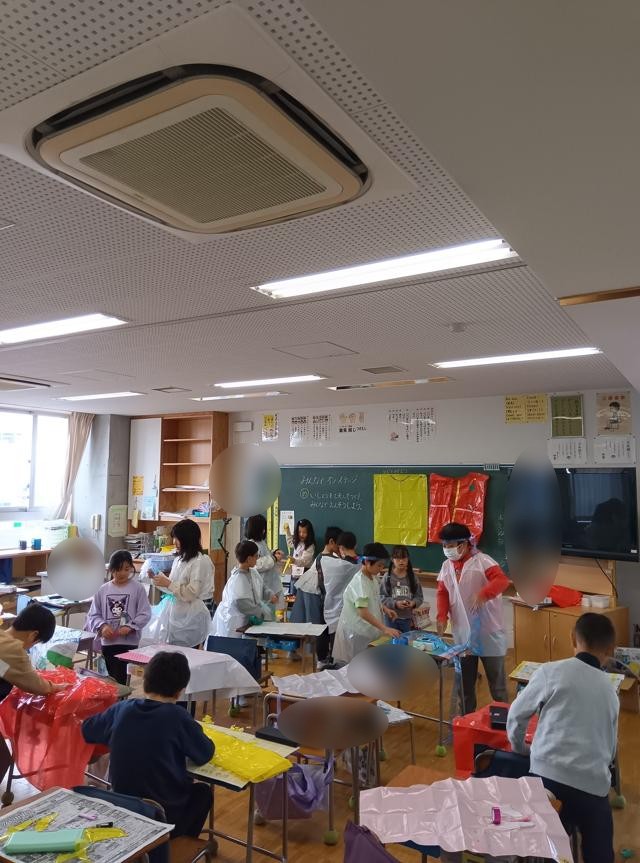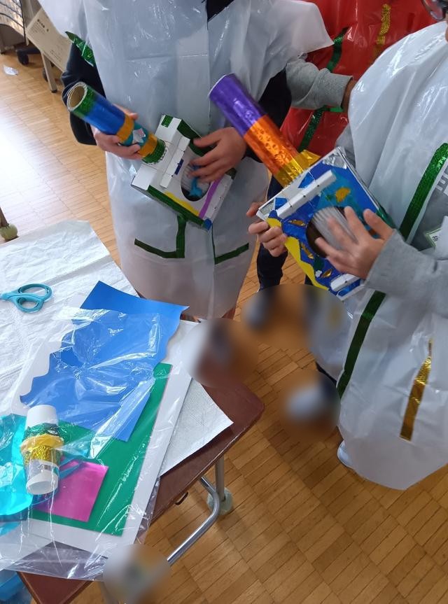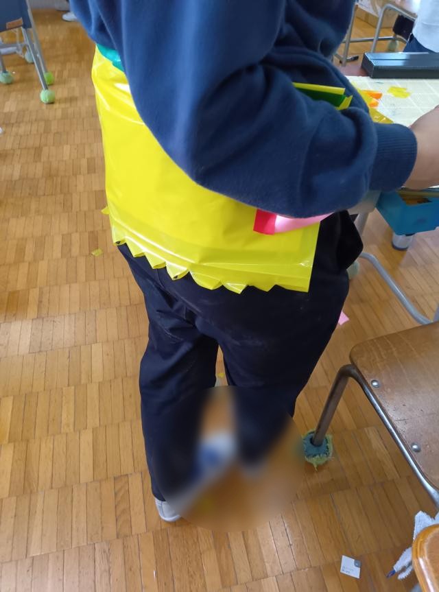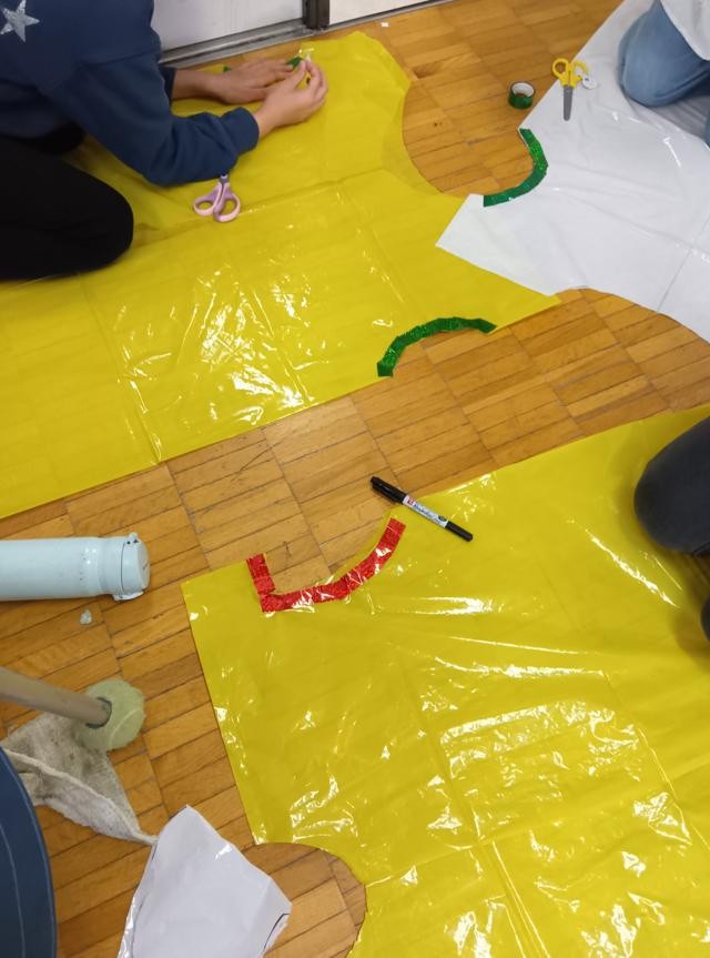 基本の形を作って装飾を施していきます。基本の形は大まかに言うと「かぶるタイプ」か「前開きタイプ」かですが、上着ではなく、腰に巻く衣装をデザインしている子もいて、発想の豊かさに脱帽でした。キラキラのテープなどを貼り、お好みの色のペンも使って、ド派手に仕上げていきます。