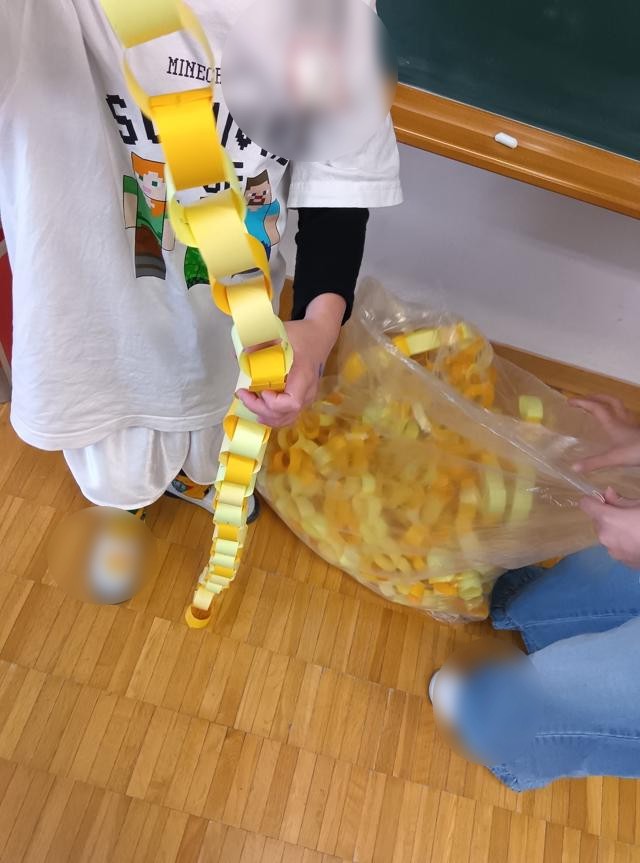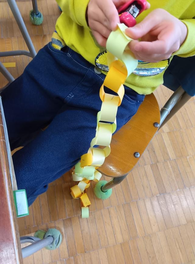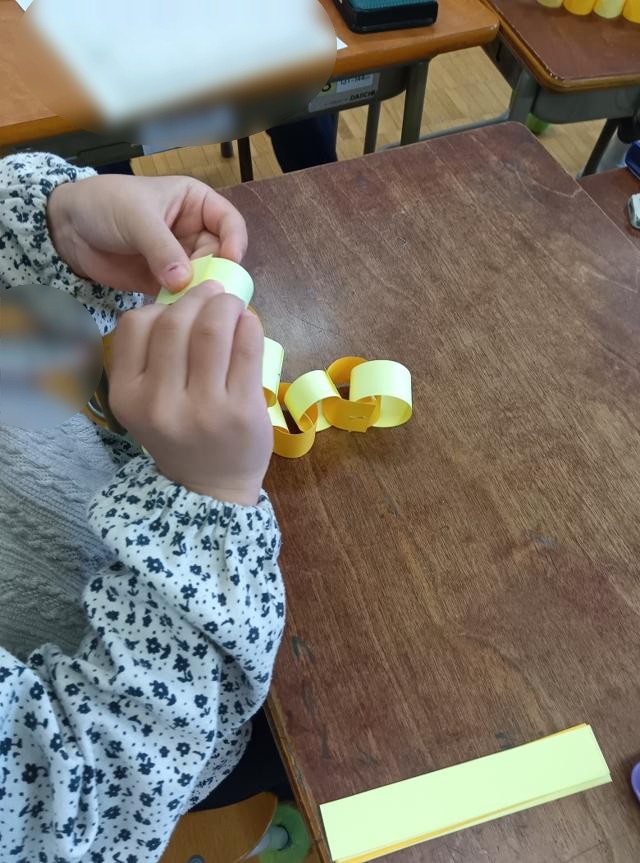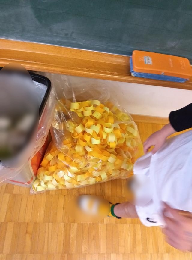 1年生は輪飾りをたくさん作っていました。入学式の飾りに使うものでしょう。3色のグラデーションが美しい輪飾りでした。