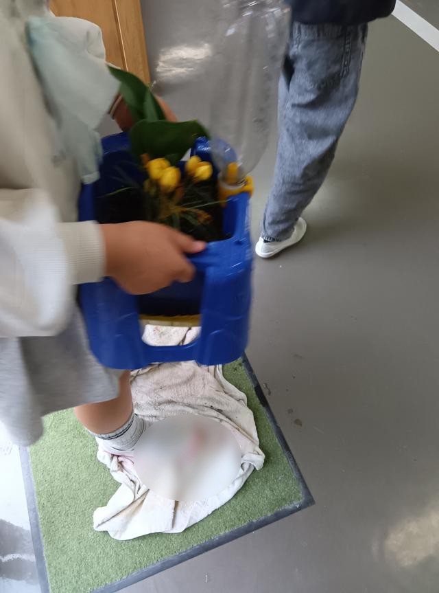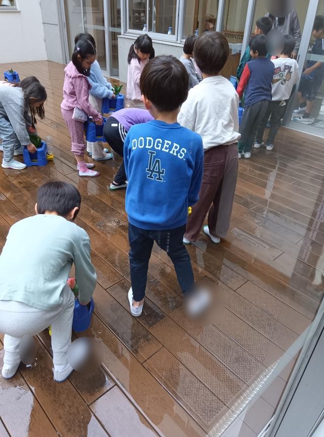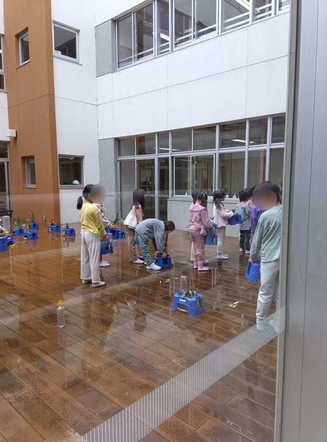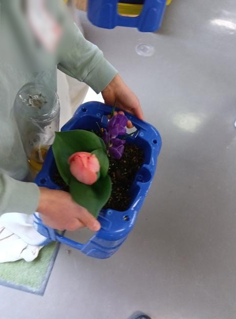それから、雨が止んだのを見計らって、きれいに咲き始めた球根の鉢植えを下に移動していました。きれいな花が卒業生を送り出し、新入生を迎え入れてくれることでしょう。