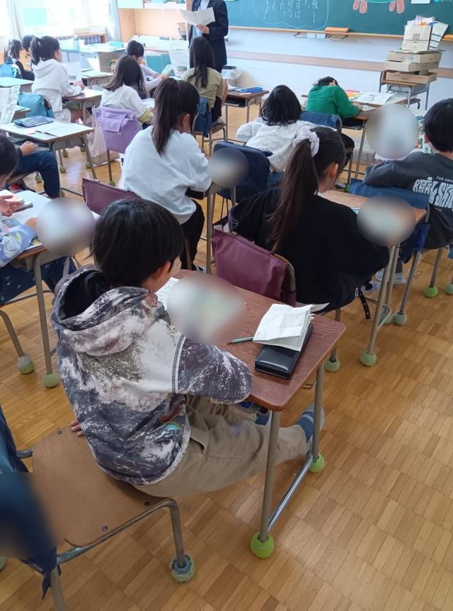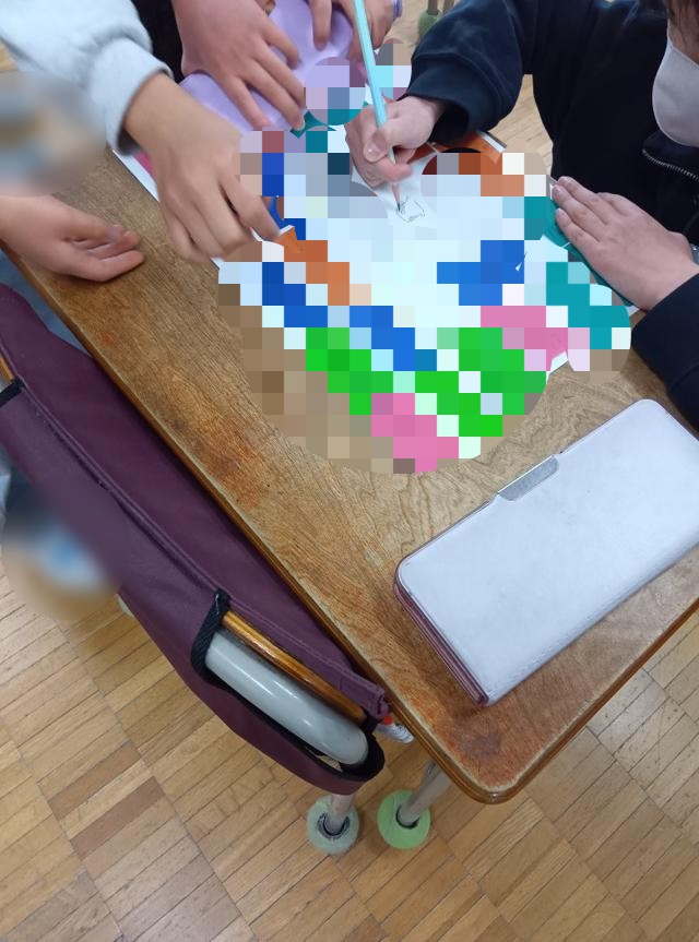 廊下で通知表を渡している中、課題に取り組んだり、片付けをしたりして待っている子どもたちですが、なにやらコソコソと・・・え、秘密?了解、モザイクかけておきます。