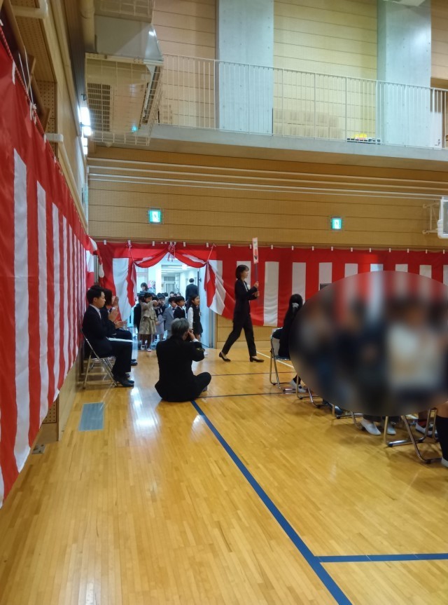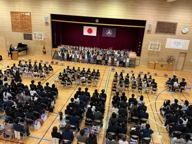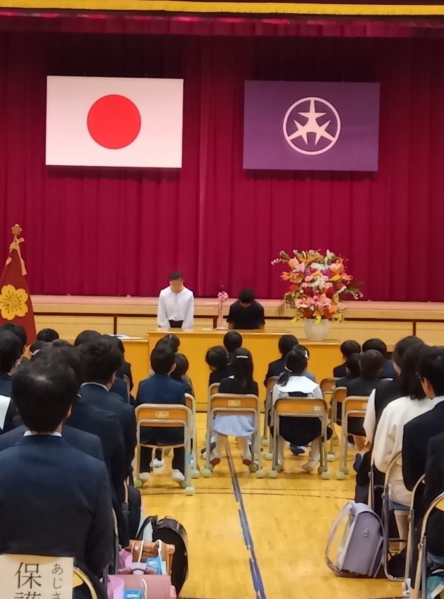 ピカピカのランドセルを背負い、桜の花びらが舞い踊る中、1年生が登校し入学式が行われました。玄関を入ると、6年生がお出迎え。ドキドキした表情だった1年生も笑顔になり、教室に案内してもらいました。
