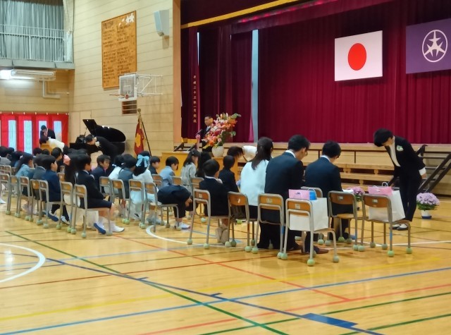 校長先生のお話を良い姿勢でしっかりと聞き、「明日から元気に通ってください。」の言葉に「はい。」と元気いっぱいに返事をしました。