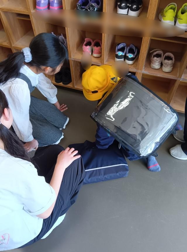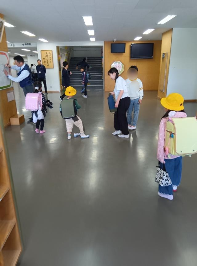1年生は、登校してきた子からさくら通りに並んで待ち、8時10分より前に順次、6年生の待つ玄関で靴を履き替え、教室へ入っていきました。教室では、朝の支度を6年生が教えてくれます。全部やってあげえるのではなく、自分でできるように教えてあげていました。そこが大事ですね。