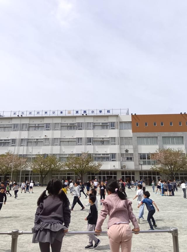 中休み、元気に校庭に出て走り回っています。大人もたくさん外に出て一緒に遊んでいます。