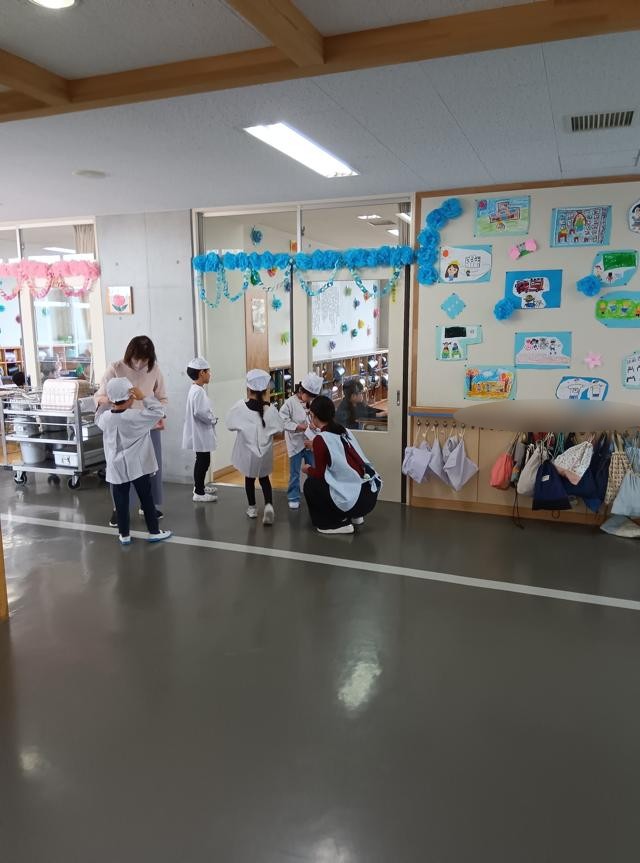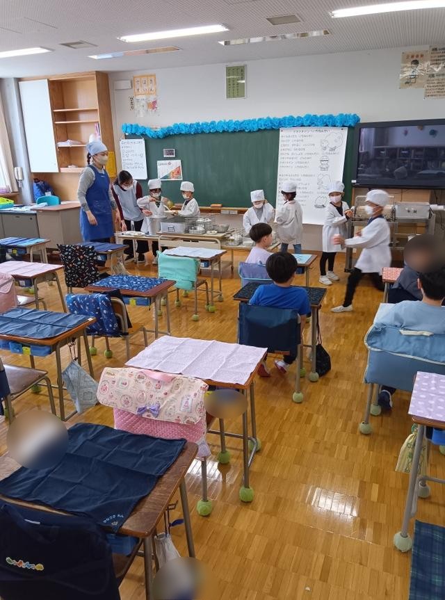 早速、給食当番にも取り組みます。全員手を洗って、ランチョンマットなどの準備をし、給食当番は白衣に着替えます。小学校の給食は、当番が皿に盛ったごはんやおかずをトレーを持って並び、受け取っていく方式で行われます。当番の仕事を確認し、並ぶ人たちの動き(一方通行!)なども確認し、配膳がスタートしました。小学校の給食は初めてなので、戸惑いつつではありますが、幼稚園や保育園でも経験があるのでしょうか、なかなか上手でした。