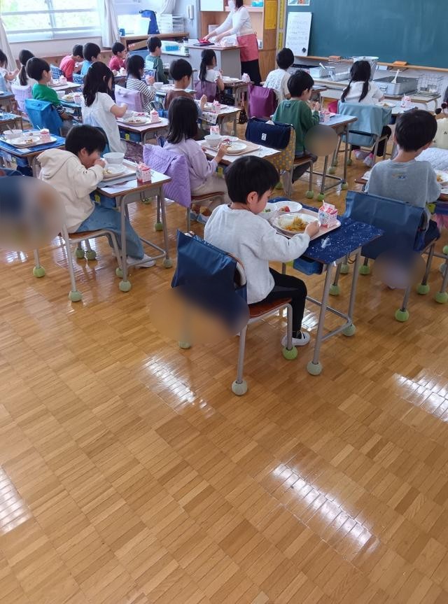 給食当番の分も含めて全員分の給食の準備が整い、いざ食べる時間がやってきました。お腹が空いて待ち切れないといった子もいましたが、みんなでそろっていただきますをして食べ始めます。