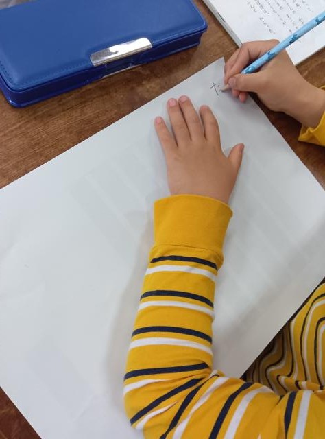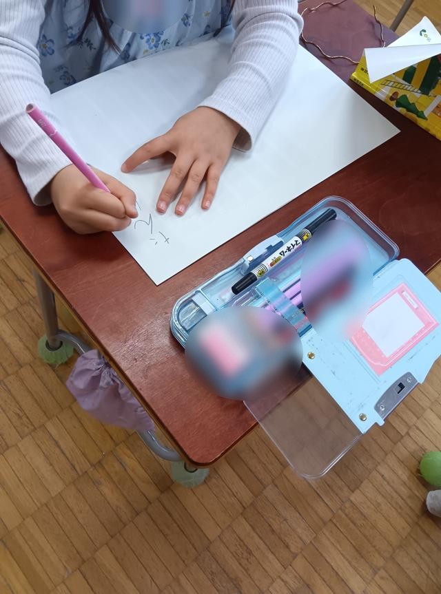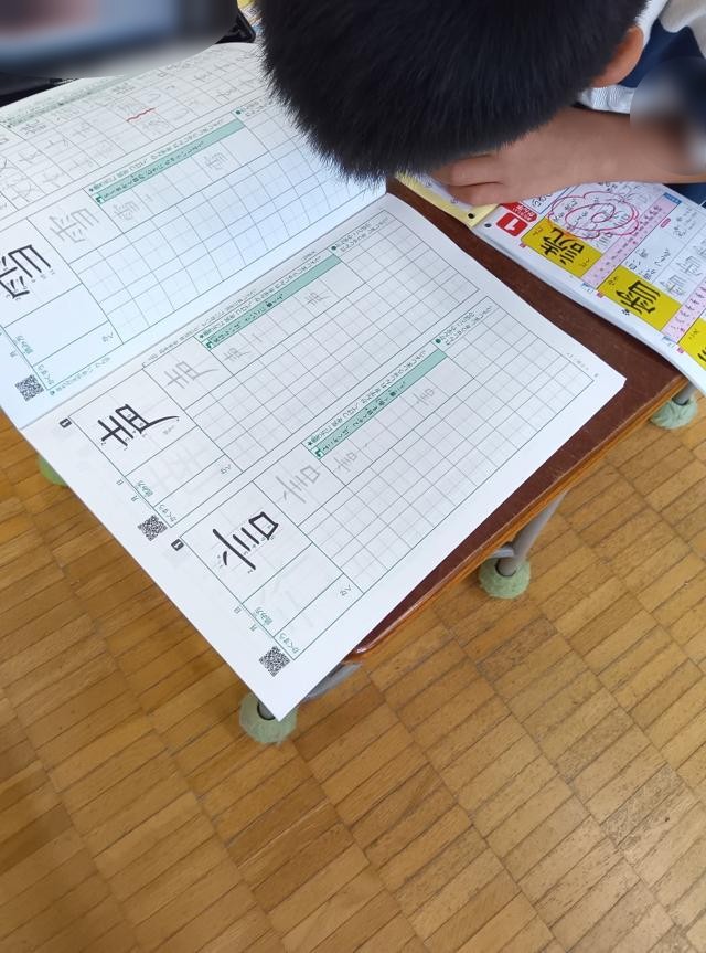 よく見ると、紙の下に黒い線が見えると思います。文字をバランスよく書くために、下に書く位置を示す黒い印が入った紙を敷いて書いていました。低学年だとそれ以外にも、線や枠の入った紙を使うこともあります。これならみんなきれいに書くことができて、気持ち良く1年間の学習を始めることができます。エンジンかかった!?