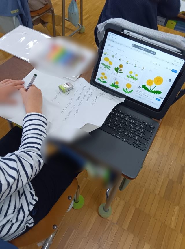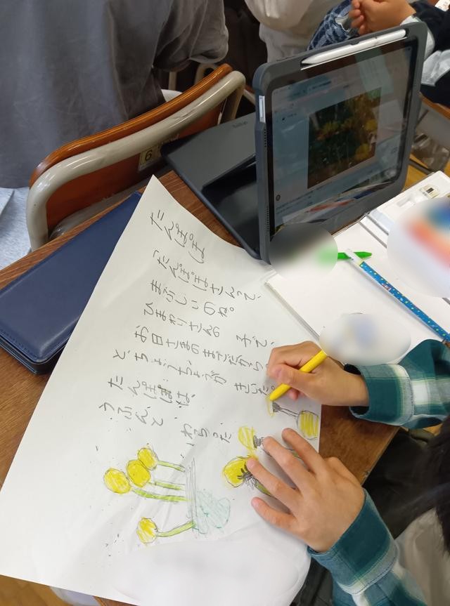詩が書けたら、絵を描いて作品として仕上げます。教科書と同じように描く子もいれば、画像を検索してオリジナルの絵を入れている子もいました。