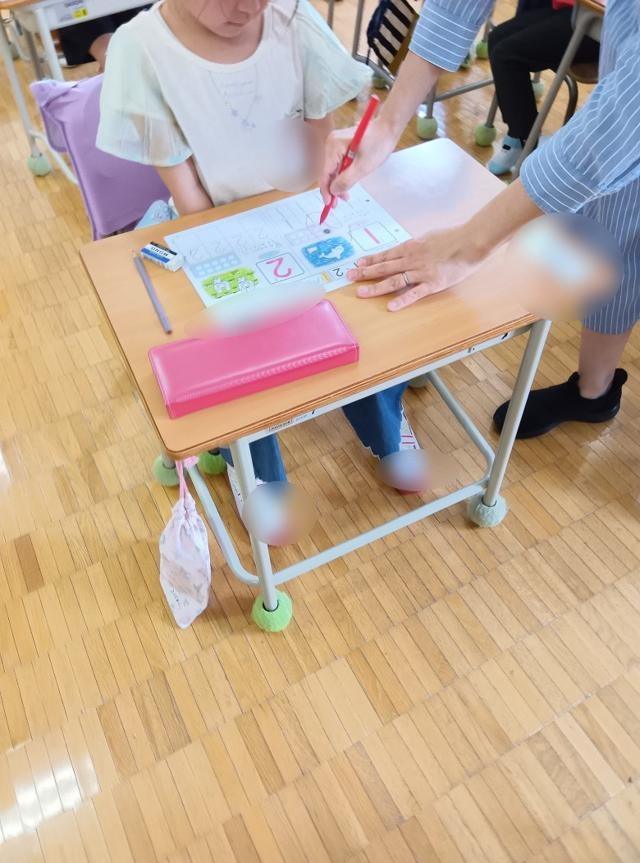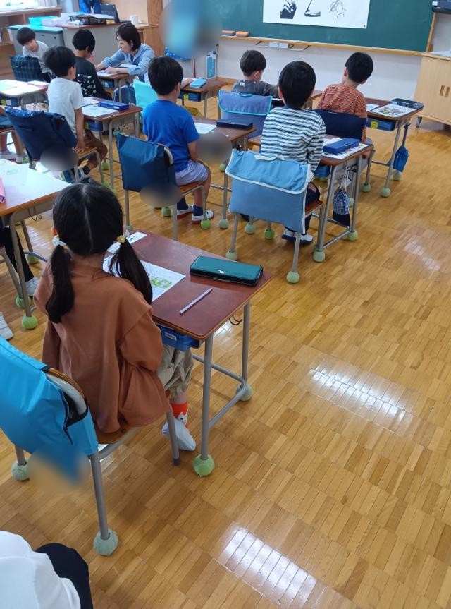 という先生の声かけで、ぴっと背筋が伸びました。順に二重丸、花丸をもらっていました。良い姿勢でそろって座っている姿、すてきでした。