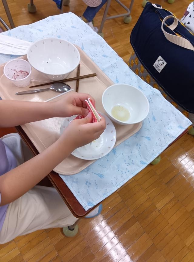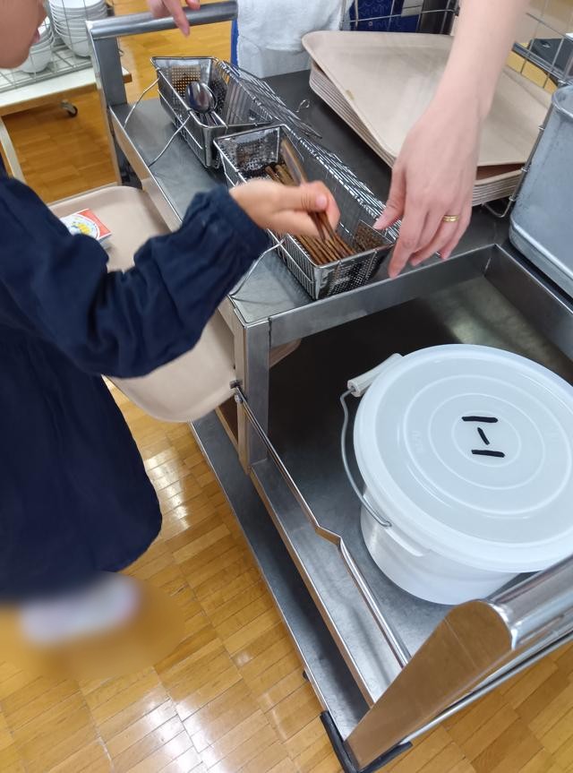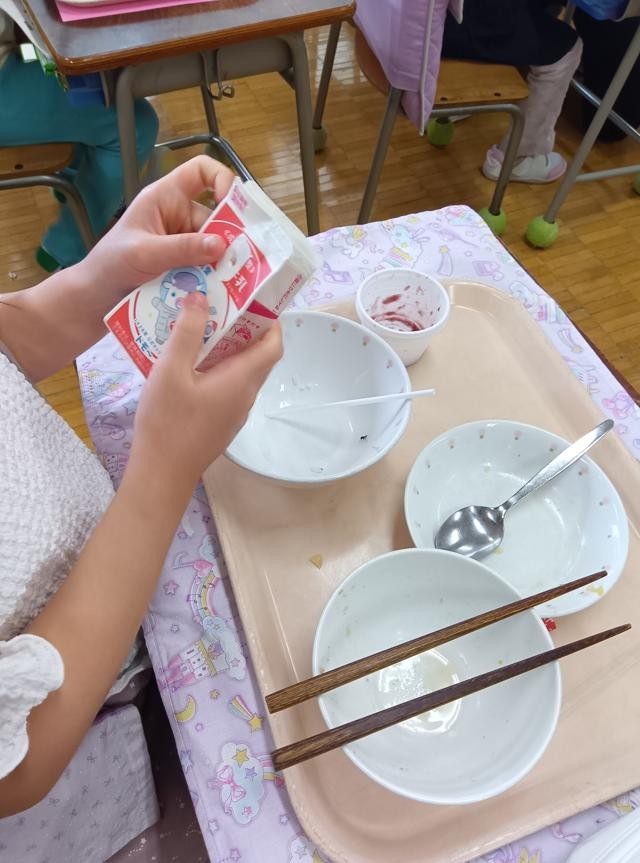 給食では、準備にも片付けにも慣れてきています。牛乳だって上手にたためます。箸やスプーン、お皿もそろえて返せます。
