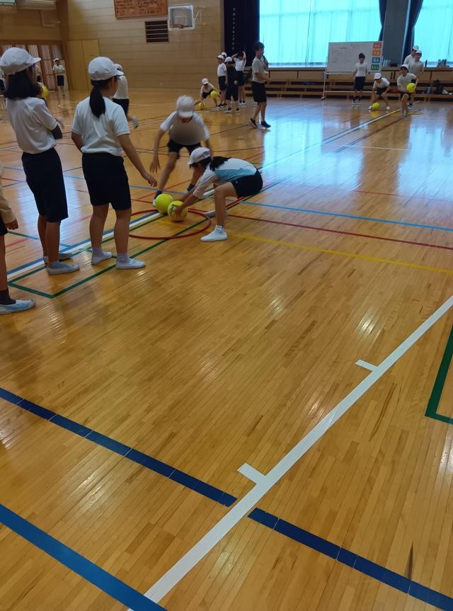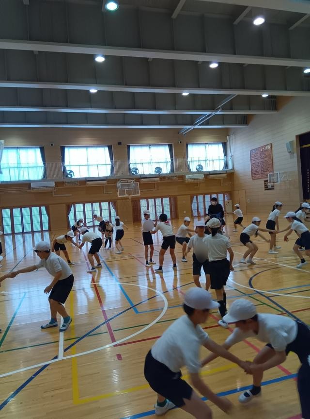 6年生の体育館体育です。いろいろな動きの運動を取り入れてたくさん運動をしています。