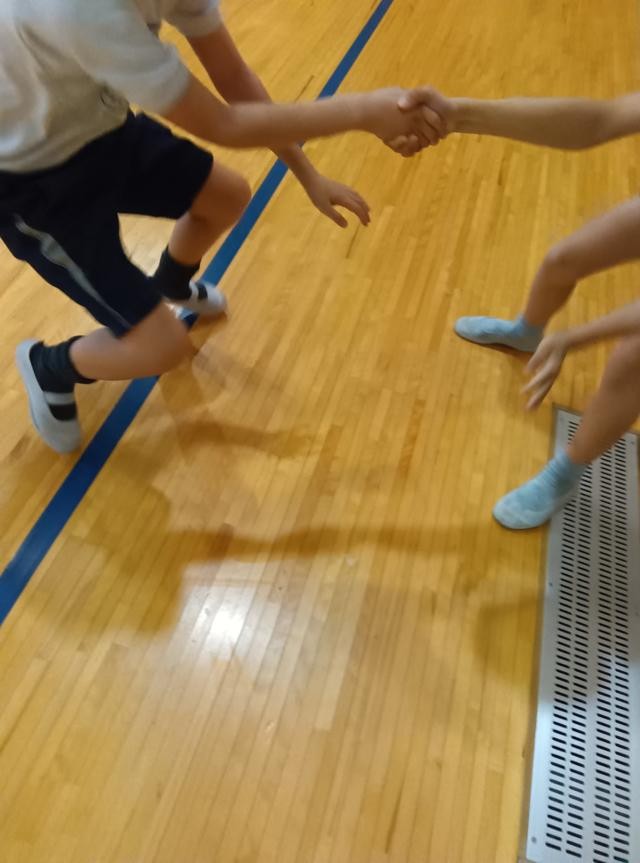 他にも、1から5までの指の数をじゃんけんのように同時に出して、同じ指ならボールを取る、とか、右手同士を握り合ったまま、相手の膝をさわると勝ちといったゲームがありました。考えながら動いたり、相手の動きに合わせて瞬間的な判断で動くなど、頭と体を使った動きやゲームがたくさんありました。