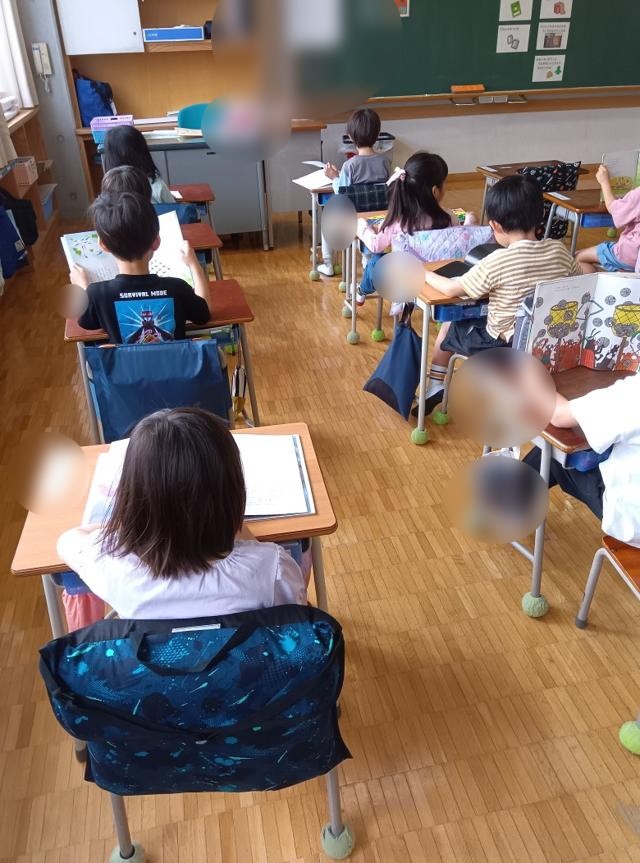 今日も6年生が朝のお手伝いに教室に来てくれています。支度が終わって座った子たちと簡単なゲームをしたりしながら朝の時間を楽しく過ごしていました。時間になったら6年生は教室に帰っていきます。名残惜しそうに、手を振りながら・・・。その後は、読書をして時間を過ごしたりしていました。ちょっとした時間に読書に取り組みます。学校では、読書で本を読んだり、学習で本を使ったりする時間がたくさんあります。本が好きな子になってほしいと思います。