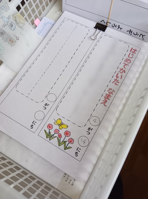 さて、「ショック!」は最後の写真です。こちらも1年生の教室で見付けました。何かというと、「はじめてかいた なまえ」のプリントです。平仮名を習い始める前に書いて、その後上達した字を並べて書けるようになっていて、2つのなまえが並ぶと成長を感じるプリントです。これを書くところを絶対見たいと思っていたんですが・・・4月14日とあります(名前のところはぼかしてあります)。逃したようです・・・ショック!