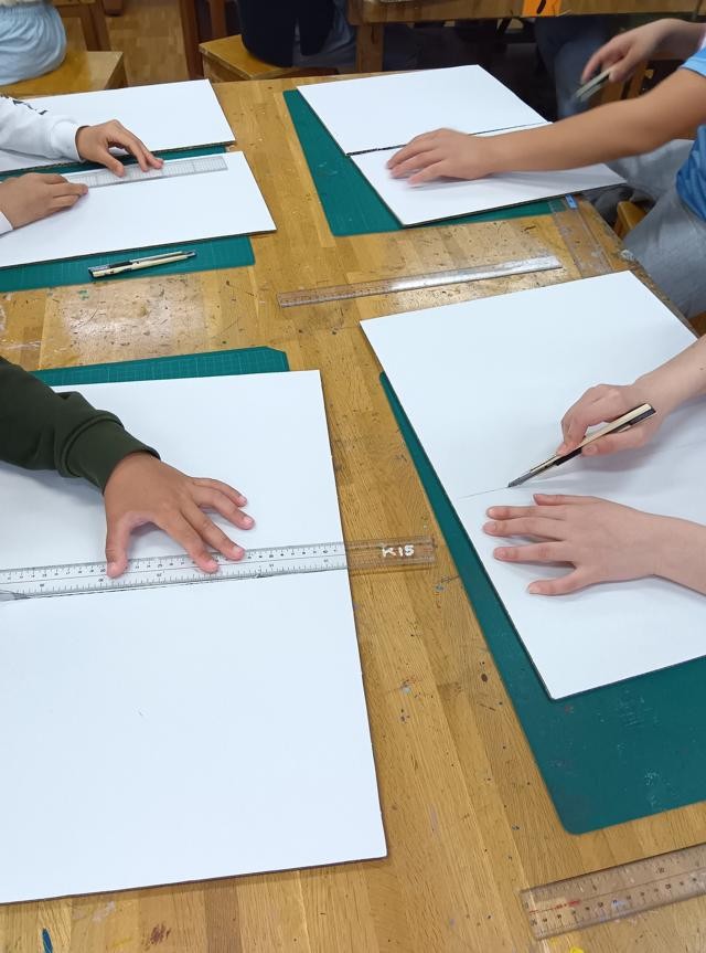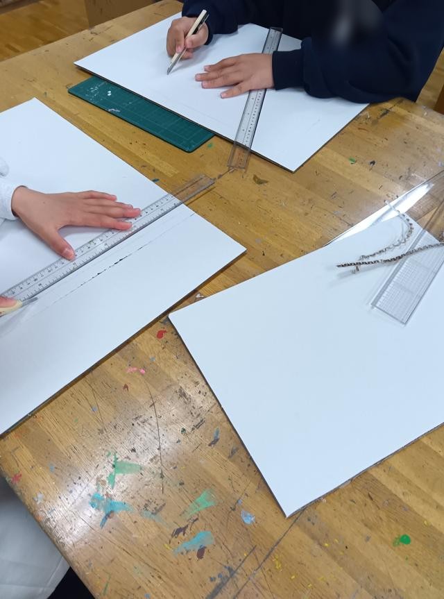 カッターを使っていきます。2年生の図工でカッターを使い始めて以来、カッターは工作には欠かせな道具です。便利ですが、手を切るなどのけがにもつながる恐れのある道具です。必ず安全指導を行ってから使い始めます。基本は、奥から手前に切ること、そして刃の先に手を置かないこと、この2つを徹底して守ればけがは起こりません。今後も、安全に気を付けて指導をしていきます。