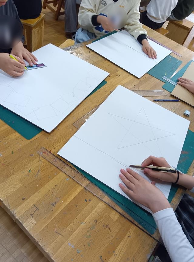 とあります。額縁で春の景色を切り取るのでしょうか。形はわりとシンプルに作り、その後の活動がメインになってくるようです。長方形のシンプルな額縁を作っている子が多かったですが、こだわりの額縁を作っている子もいました。鉛筆で描いた線なので見にくいかもしれませんが、何人かおもしろい形やモチーフで額縁を作っているのが見えると思います。顔の形にしようとしている子も!どんな風に見えるんでしょう。