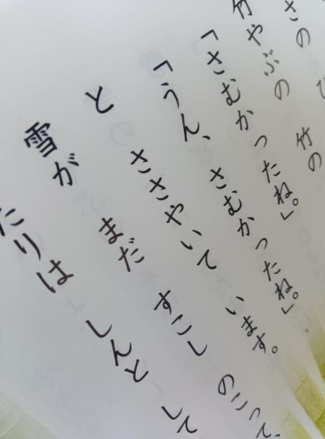 です。2年生は、1年生でいろいろな物語文を読み力を付けてきました。1年間の間に、文も長く、内容もだんだん難しくなってきていました。今回の「ふきのとう」の学習では、1年生での学習や学習を通して身に付けた力もふり返りながら、物語の場面の様子や「誰が」「何を」したか、「何を言ったか」などの登場人物の行動などを基に、「出来事」や「結末」など物語全体の内容を捉える基本的な力を確認し、育てていきます。音読にも丁寧に取り組んでいきます。
