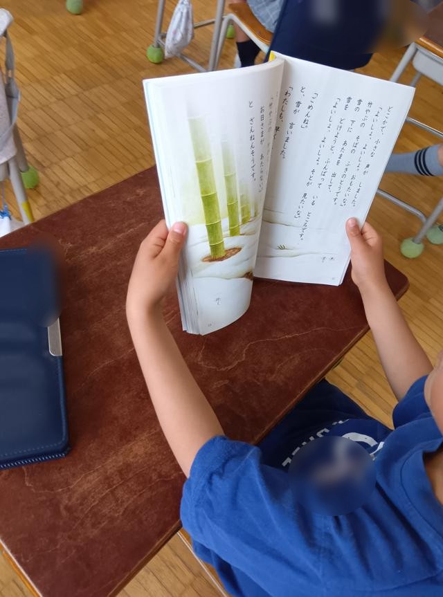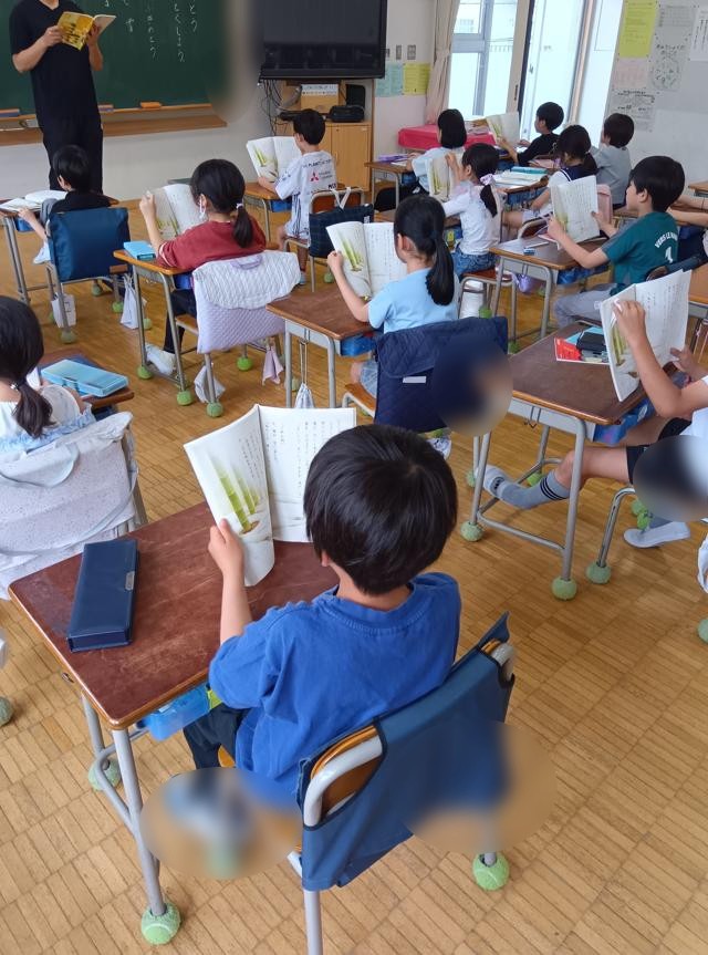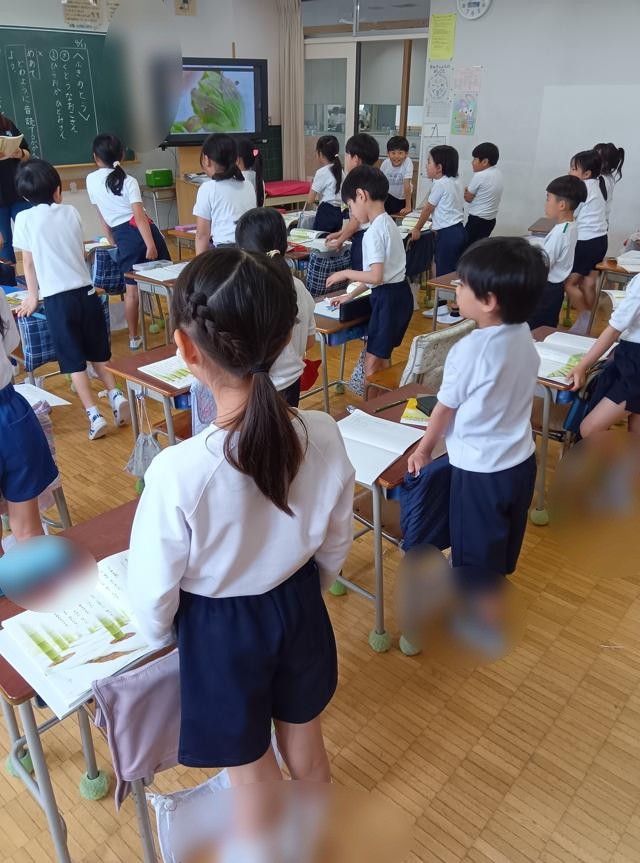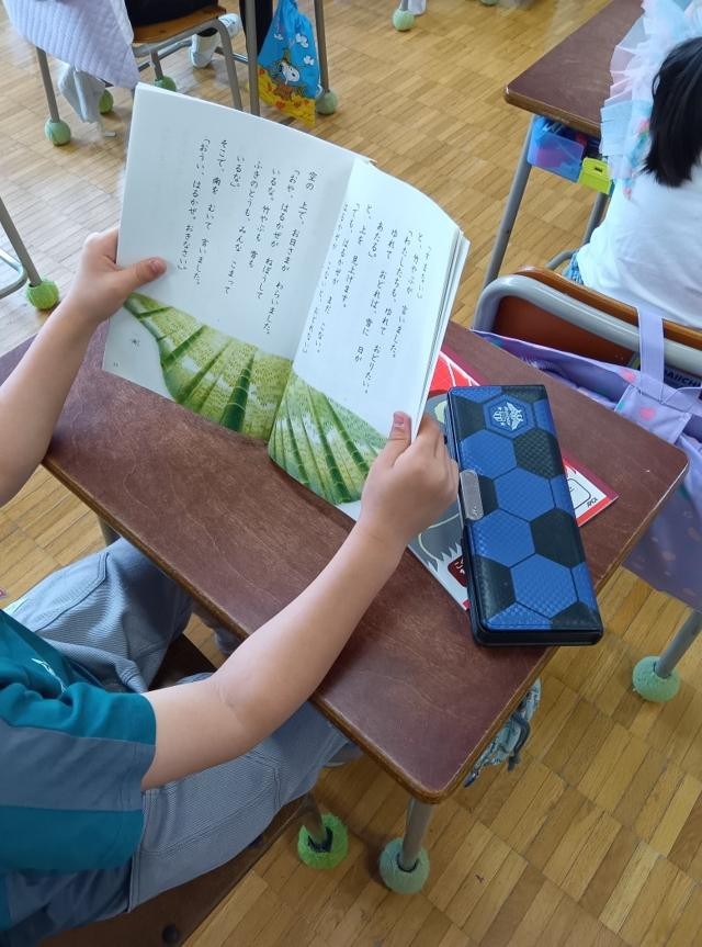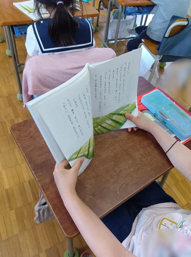 全員で音読をしていました。文の中に「ささやいています。」と書いてあります。どんな風に読めばよいでしょう。そんなことも確認しながら学習を進めていました。学年のスタート、丁寧に進めています。