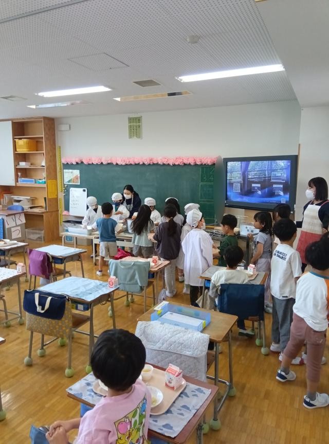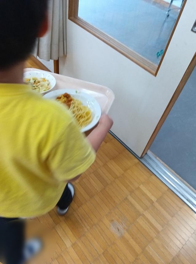 だからと言うわけではないんですが、「1年生×スパゲティミートソース」というのが、少しに気になって給食の準備の様子を見に行きました。給食の準備にもずいぶん慣れてきた1年生、上手に準備が進んでいました。食べるところまでは見られませんでしたが、口の周りがミートソースだらけ・・・なんてことはなかったことを祈りましょう。いっぱい口に付けて帰ったり、服に付けて帰ったりしていたらすみません。