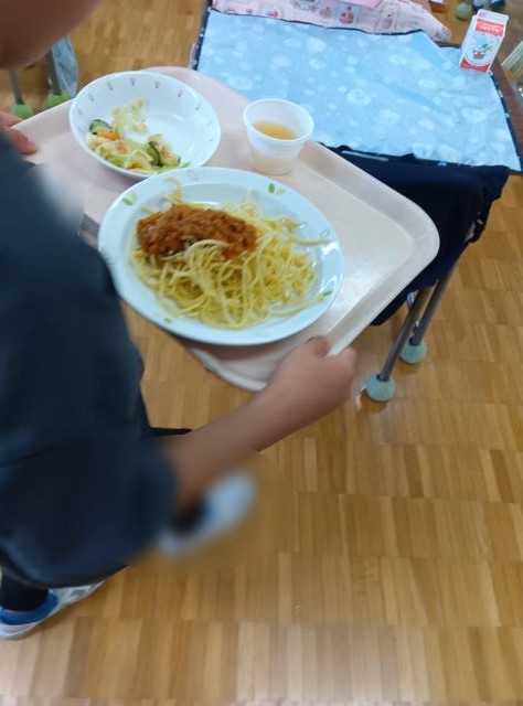 今日の給食は、スパゲティミートソースでした。しっかり肉が入って本格的なミートソースです。