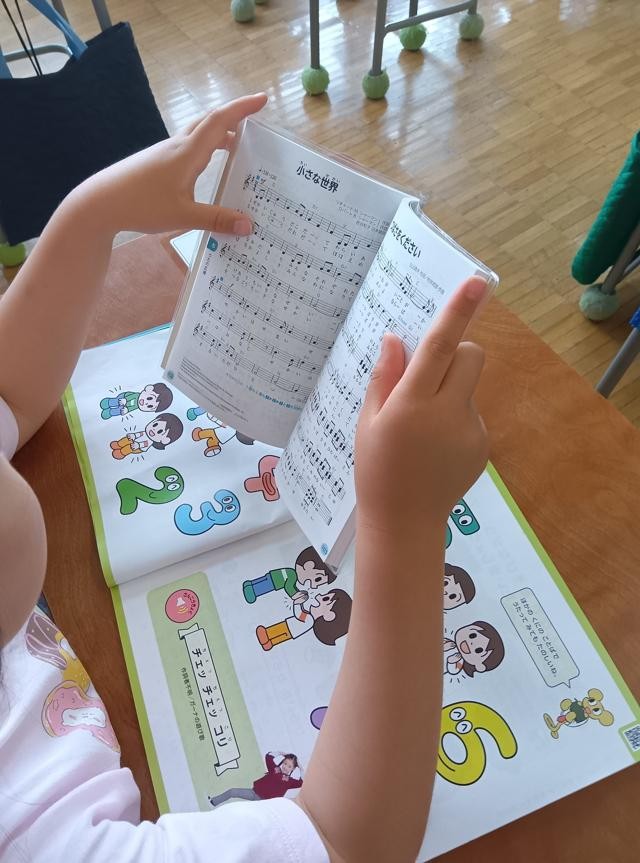 一度聞くと、「イッツアスモールワールドだ!」と知っている子もたくさんいて、歌集の歌詞を見ながら元気に歌っていました。