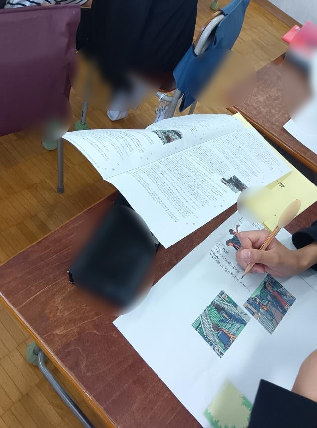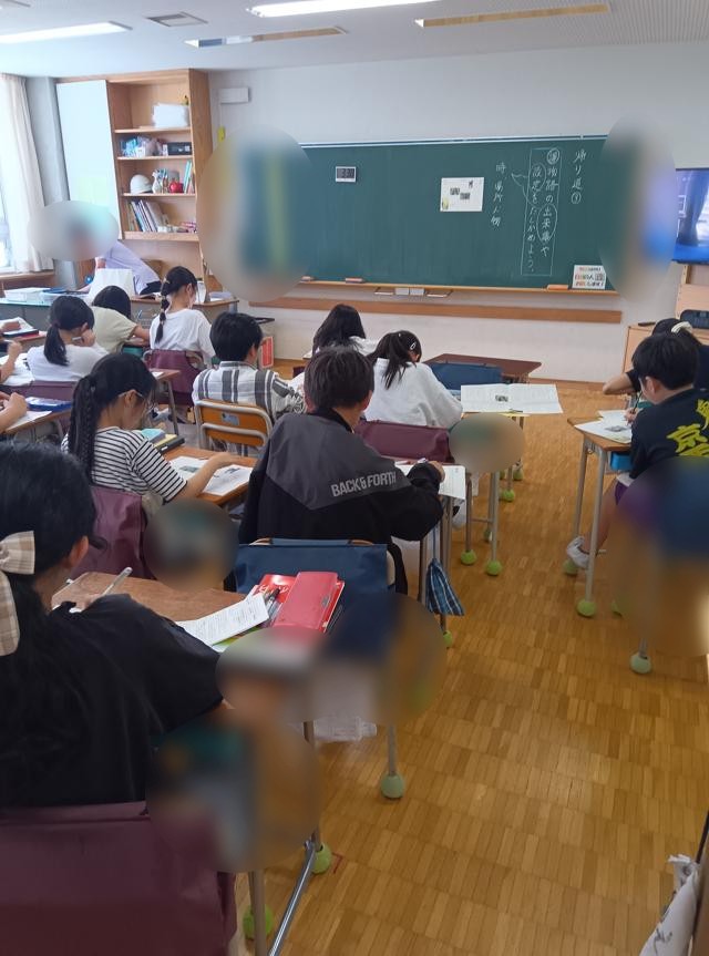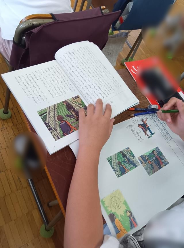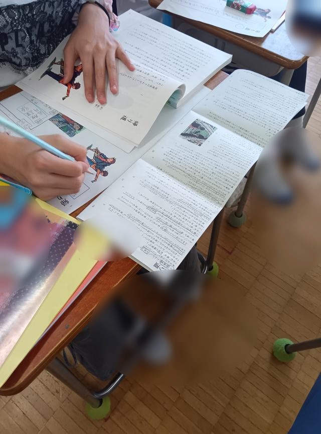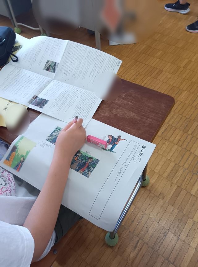 6年生がいて、国語の授業中でした。静か過ぎて本当にいないのかと思いました。戻って後ろのドアからイン!物語「帰り道」の場面を読み取っていました。個々の活動のときの集中力!