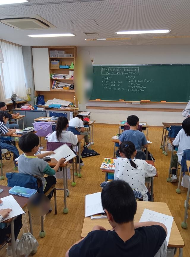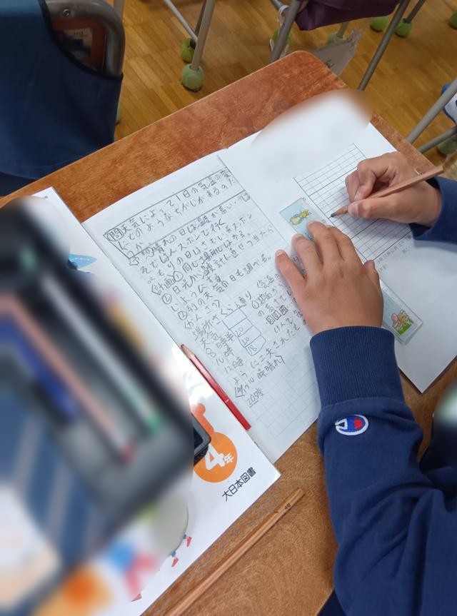 昨日曇りの日の気温を測っていた4年生。途中から雨にはなりましたが、「くもり→雨」の1日の気温を測り、5校時にまとめていました。雨にはなりましたが、一日中気温の変化が少ない日の観測ができました。夜は肌寒くなり、今朝も少し冷え込みました。その辺りも気が付いて今後の学習の中で共有していけるといいですね。まだまだこれから様々な天気の気温の観測が続きます。タイミングよく学習が進みますように。